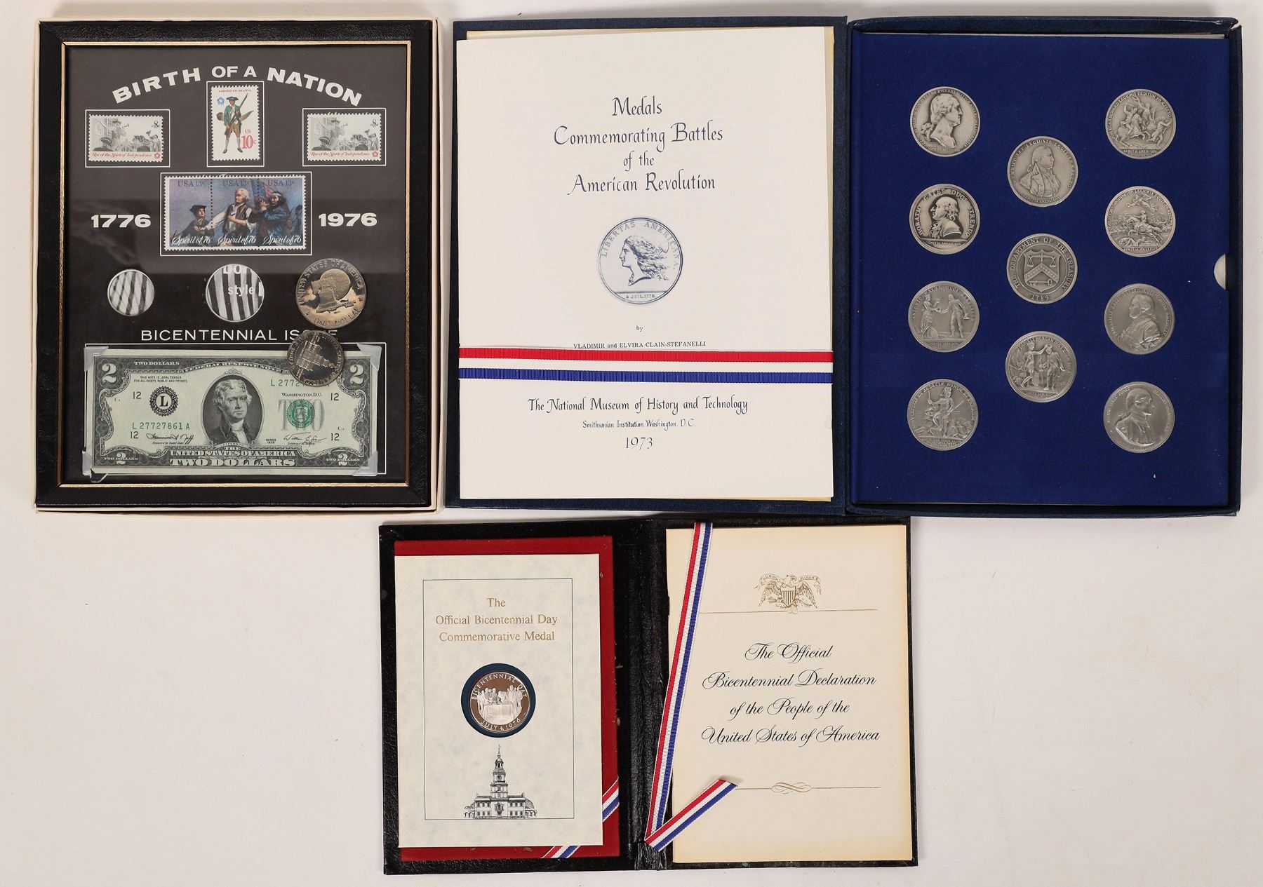 Lot of three patriotic pieces: 1) from the Bureau of the Mint in 1973: Medals Commemorating Battles of the American Revolution. 10 pewter medals in a case with a 44 page brochure by Vladimir and Elvira Clain-Stefanelli explaining the history. 2) Birth of a Nation: framed tribute to the Bicentennial with four commemorative stamps, the Bicentennial quarter, half and dollar, and a two dollar bill. Also a copy of the Declaration of Independence. 3)Official Bicentennial Day Commemorative Medal, signed by members of the U. S. government.