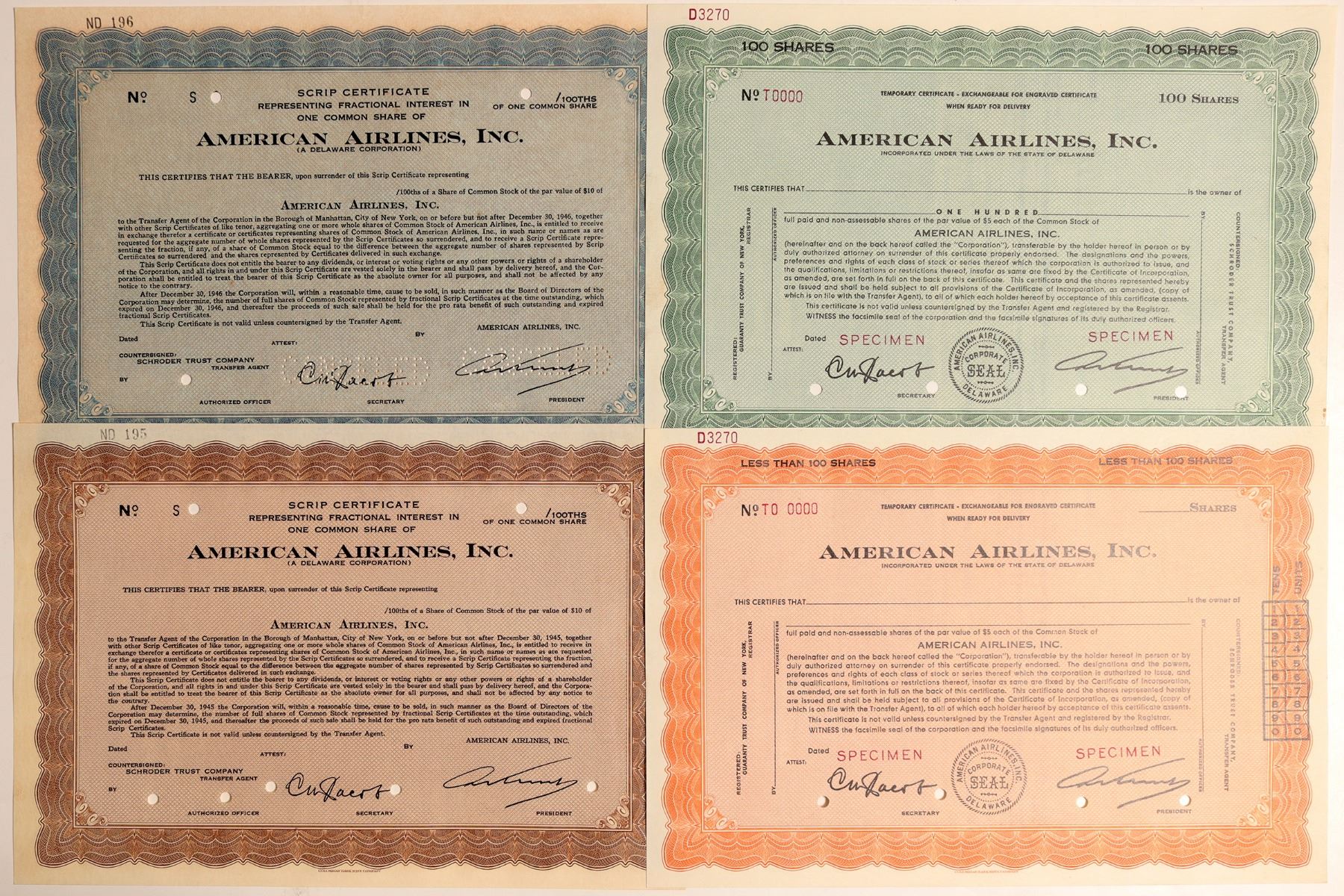Lot of four different certs. Two similar: one orange and one green. Two other similar: one brown and one dull blue. Nice grouping of a major airlines company. Ken Prag Collection
