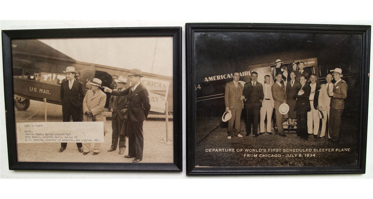 Lot of 2, 8 x 10 black and white framed photos. 1) Departure of Worlds First Scheduled Sleeper Plane from ChicagoJuly 8, 1934. A group of unidentified men and women are standing on the tarmac at night beside the plane. 2) C.R. Smith and 3 other aviation dignitaries stand in front of one of American Airways U.S. Mail planes. In 1934 American Airways changed its name to American Airlines, so this picture pre-dates that change. Both photos are framed, under glass. Ready to hang. From the American Industrialist Collection.
