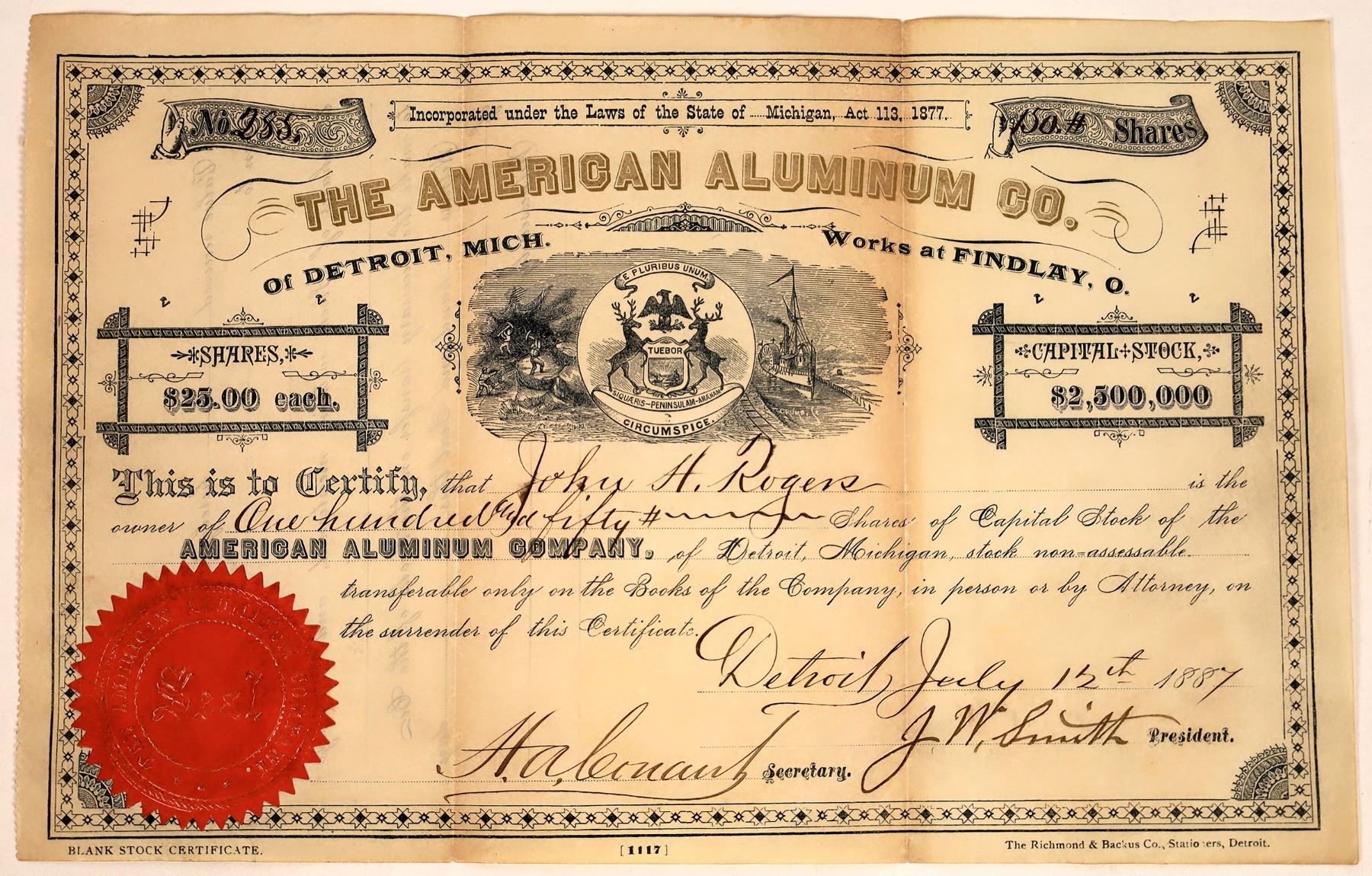 American Aluminum Co., incorp in Michigan in 1877, issued to John H. Rogers for 150 shares at Detroit, 1887, signed by J.W. Smith as president. I/uc. This light weight metal was first extracted from ores in the 1830s, but not able to be made into commercial products successfully until about 1889, two years after this cert was issued. Clearly, this company was a very early company trying to develop a commercial method of aluminum extraction and metallurgy.