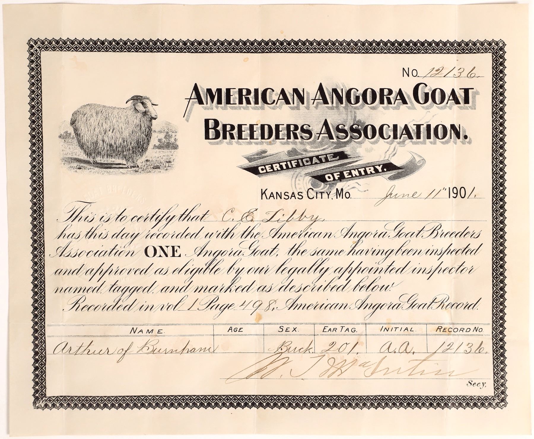 Certificate of Entry, Kansas City, MO, 1901. CE Libby has recorded one goat, a buck named Arthur of Burnham. Vignette of goat. 7 x 8.5" Folds. Unusual. Missouri Kansas City 1901