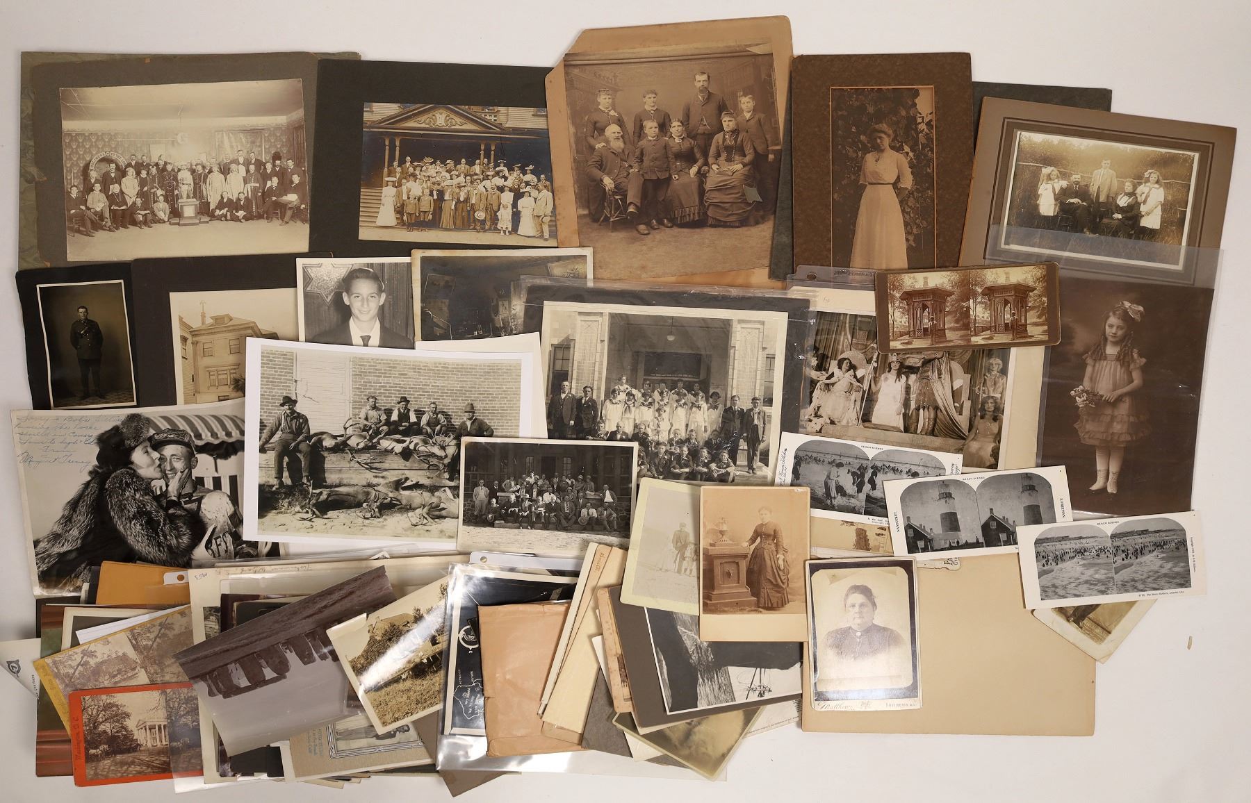 approx. 100 photos more than half are mounted pre 1900 photographs. Most are all unidentified includes groups of people inside and out, interiors, exteriors, portraits, also included are many cabinet cards and tintypes. There are a few stereo views including the white house. Falstaff beer advertising RPC. Includes about 30 California pieces including a CPRR. Some of the early photos are identified by the photographer but not many. Also included are a number of actor/actress photos from the theatre and Hollywood, some autographed.