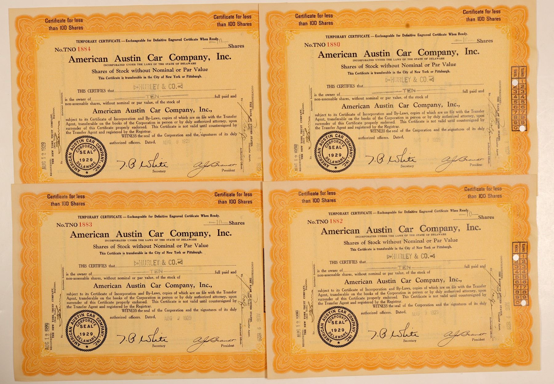 Lot of 4 temporary certificates issued in 1929 to Hurley & Co. None cancelled. Orange border and background, black print. 7.75 x 10.5" Inc. 1929, Delaware. Printed signatures of president and secretary. Folds, toning. Located in Butler, PA, they produced motorcars licensed from the British Austin Motor Company from 1930 through 1934, when it filed for bankruptcy. In 1935, the company was reorganized as American Bantam. Production resumed in 1937 and continued through 1941, including the first prototype of what later became the Jeep. Ken Prag Collection