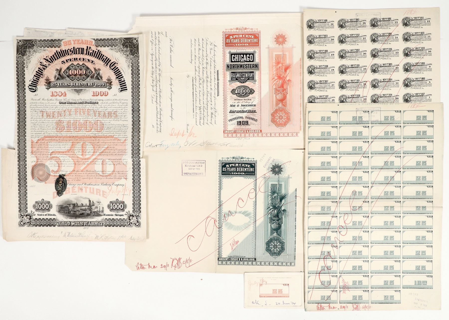 Lot of 5. 1. All are Chicago and Northwestern Railroad Co. A. 5% 25 yr. debenture bond. Dateline 1884. train vignette bottom center. complete w/ attached coupons, one torn.. and a sheet of coupon numbers. Handwritten notes "OK" . B. Red print/border. 1909 25 year 5% bond reverse w/ card July 1884 w/handwritten "OK". The bond has handwriting also dated Sept 1 1884 "OK". C. Green print/border, 1909, 25 year, 5% bond backed, "cancelled" handwritten dated 1911. Complete with coupon sheets front and back, also handwritten "cancelled" 1911. and stamped. All are Fine or better cond.