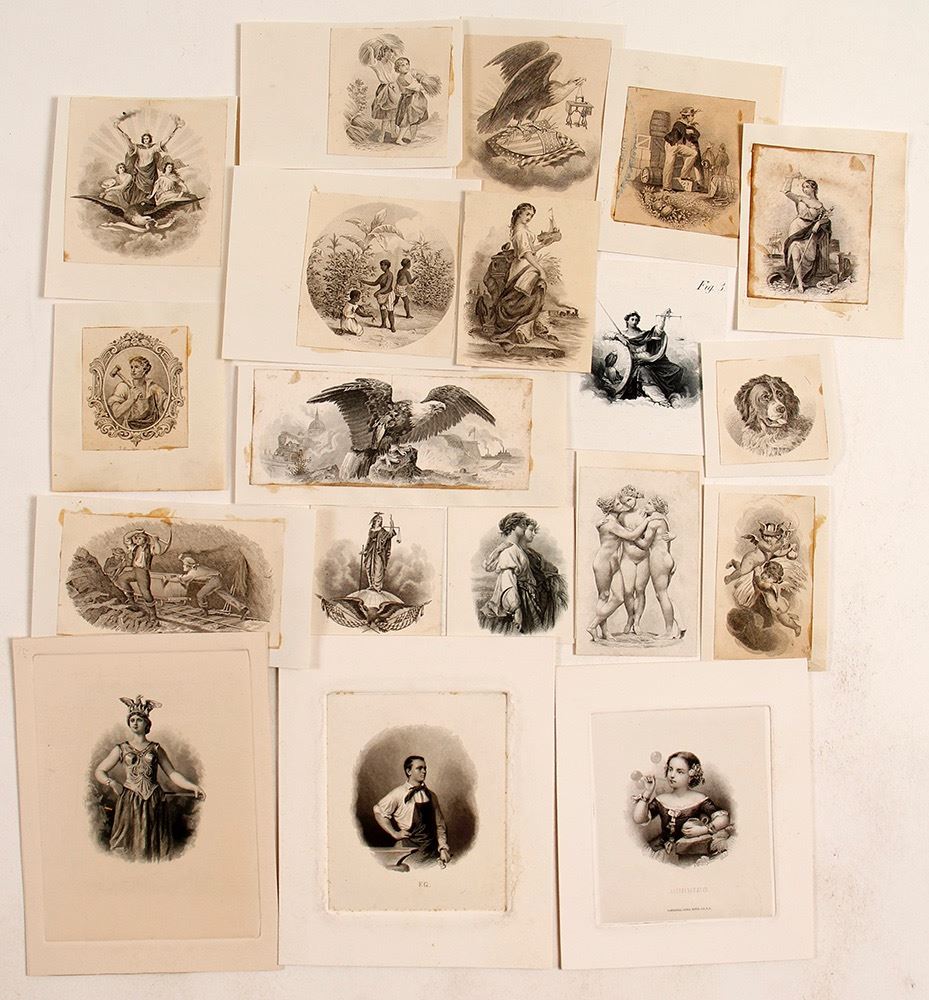 Nineteen high quality proofs of vigenttes used by the American Bank Note Co, probably all mid to late fourth quarter nineteenth century. The group includes: one underground mining ; one African-American; eight Liberty related; five generic or cupid related, four business vignettes (shipping, blacksmith, etc.) These vignettes were used on checks, money, letterheads, covers, etc. HWAC# 62938 Date: Location:
