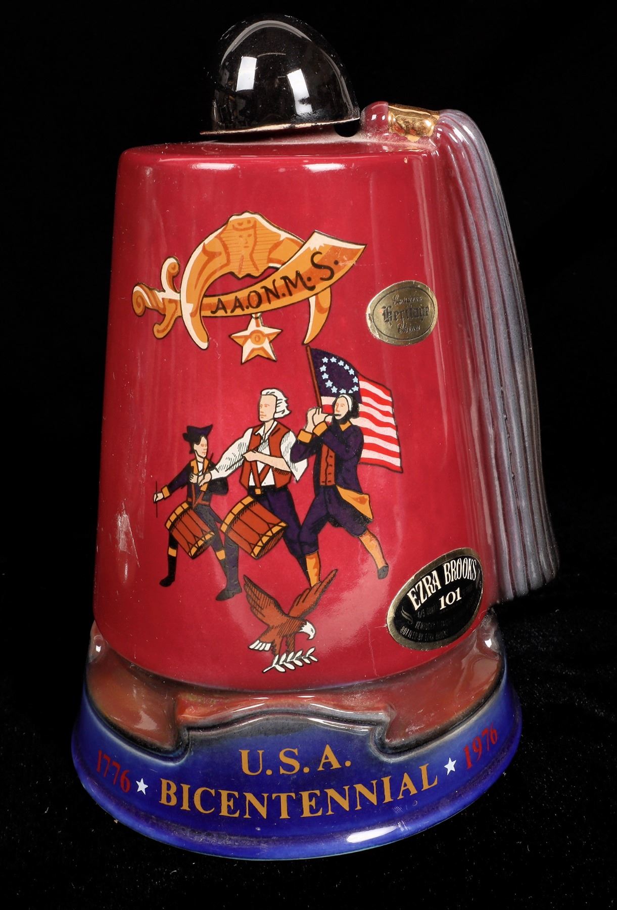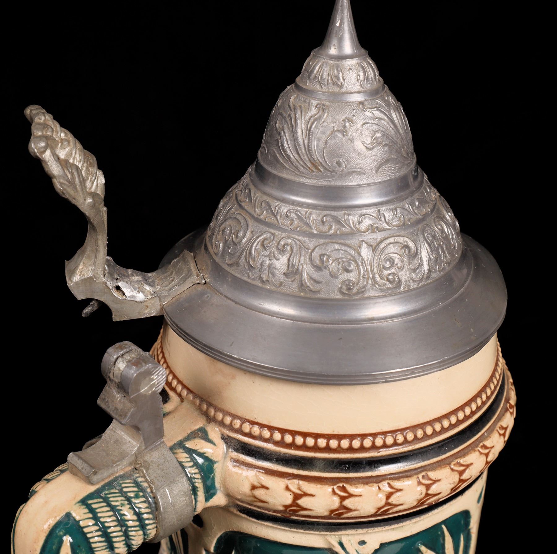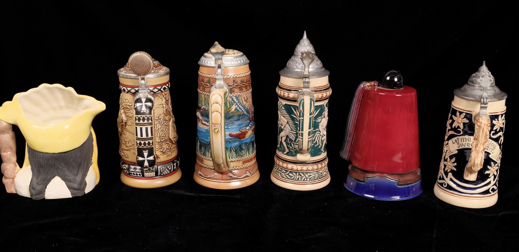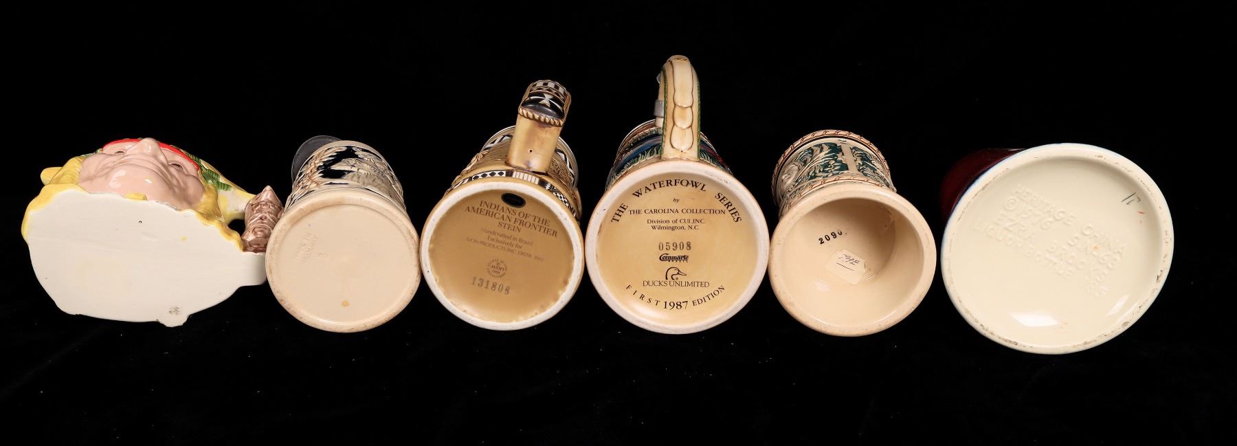 7 different American beer mugs. Green Indian, 10.25", detached lid. Indian, 7.25". Ezra Brooks decanter 8". 1988 Avon Indian, 9.25". German dark cobalt, 9". 1987 Ducks Unlimited, 10". No apparent chips or cracks.