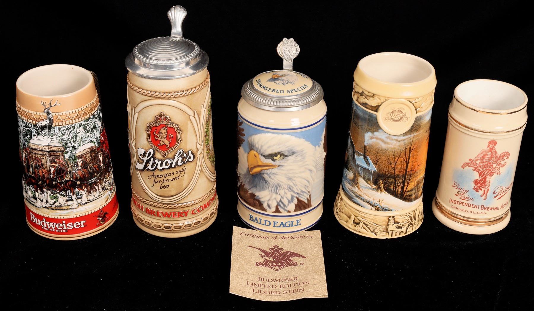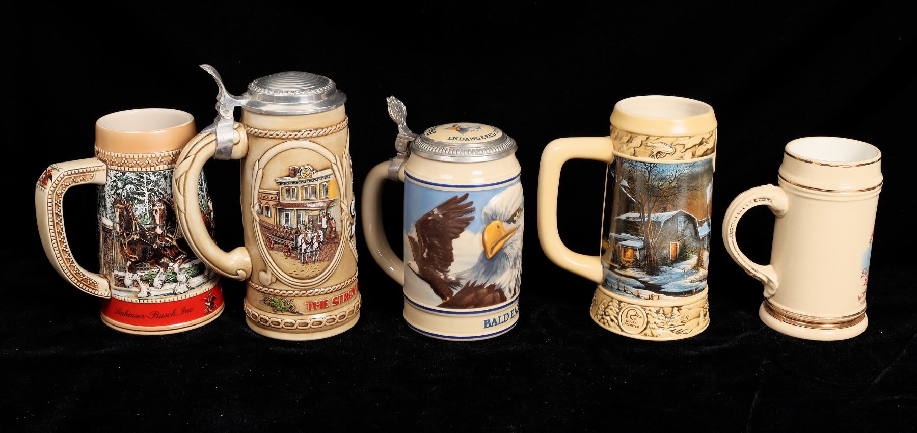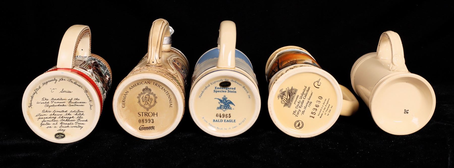 5 different American brewer commemorative beer steins. Ducks Unlimited, 1996, #153630, 7". Stroh's, #08993, 8.5". Burg Brau, 5.75". Budweiser Bald Eagle, #04965, 7". Budweiser, C series, 6.5".