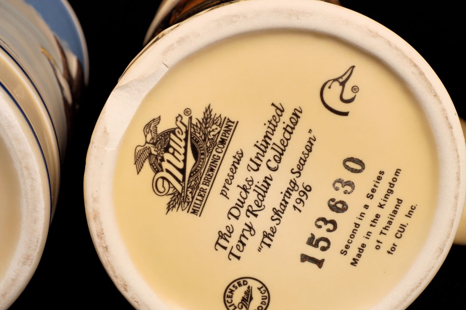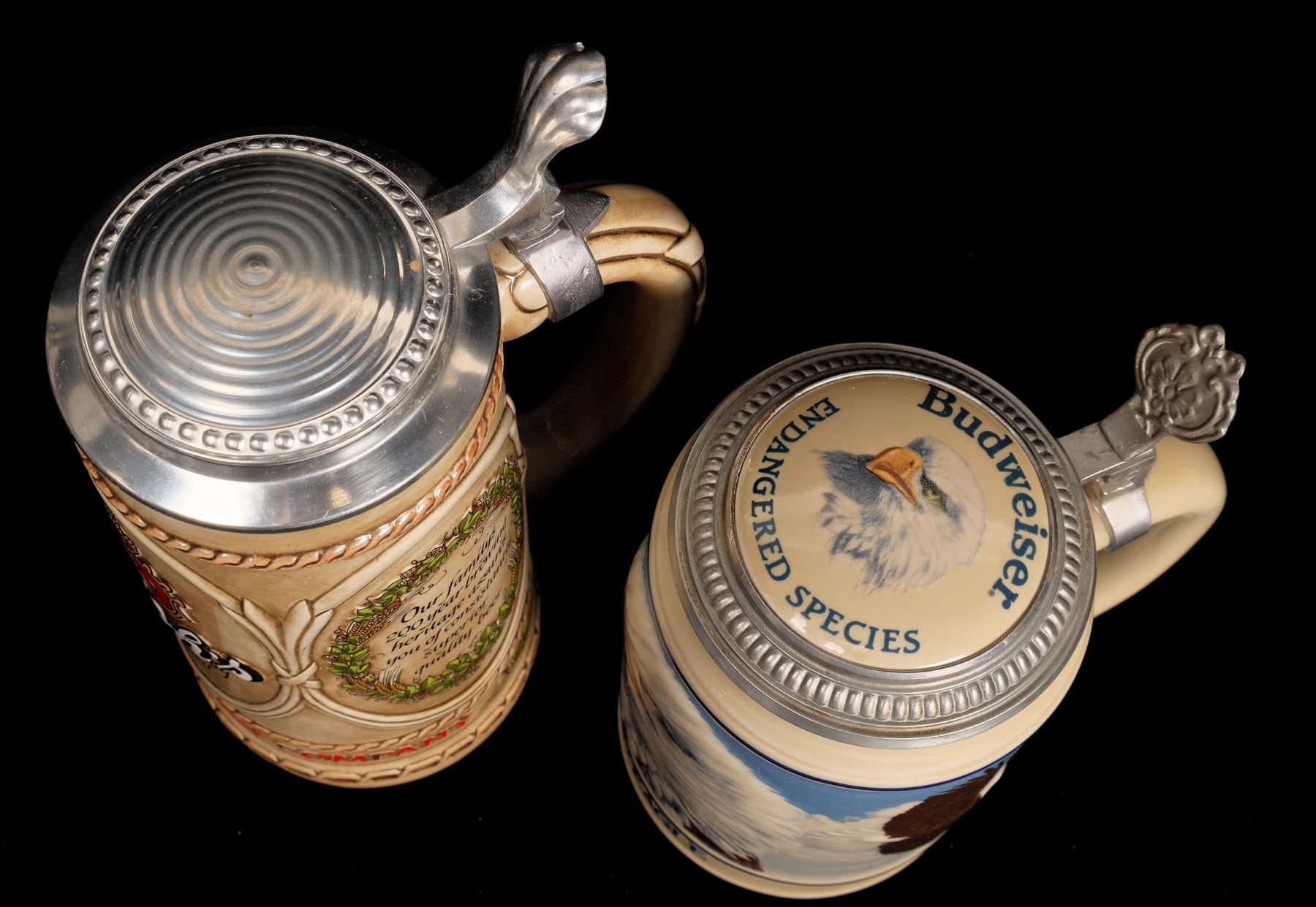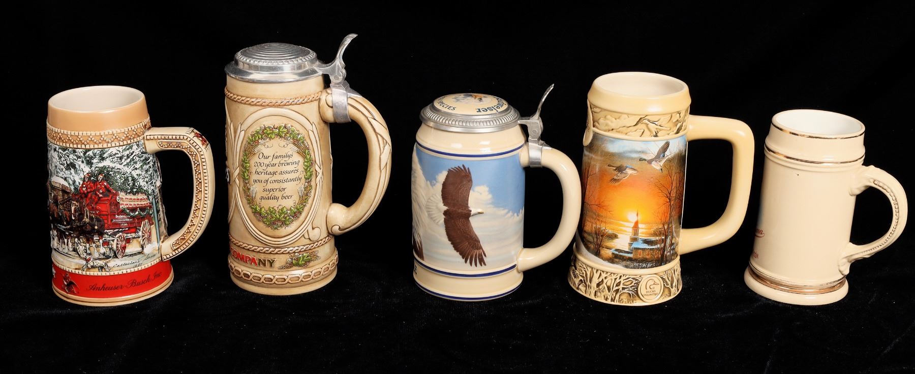 5 different American brewer commemorative beer steins. Ducks Unlimited, 1996, #153630, 7". Stroh's, #08993, 8.5". Burg Brau, 5.75". Budweiser Bald Eagle, #04965, 7". Budweiser, C series, 6.5".