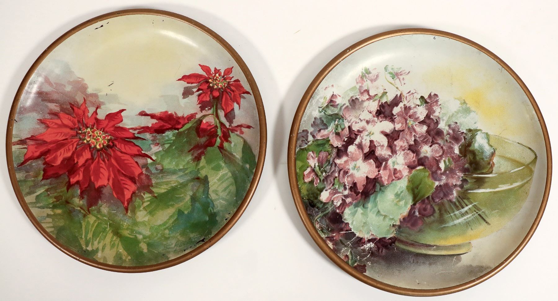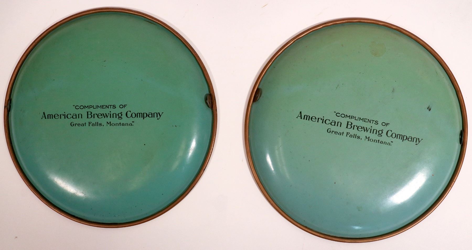 These are two beer trays from the American Brewing Company of Great Falls, Montana at 10 in. across. Each has two fasteners on the back for wall mounting. One tray depicts Poinsettias and the other is little purple flowers. In good condition with minor scuffs. Great Falls Montana
