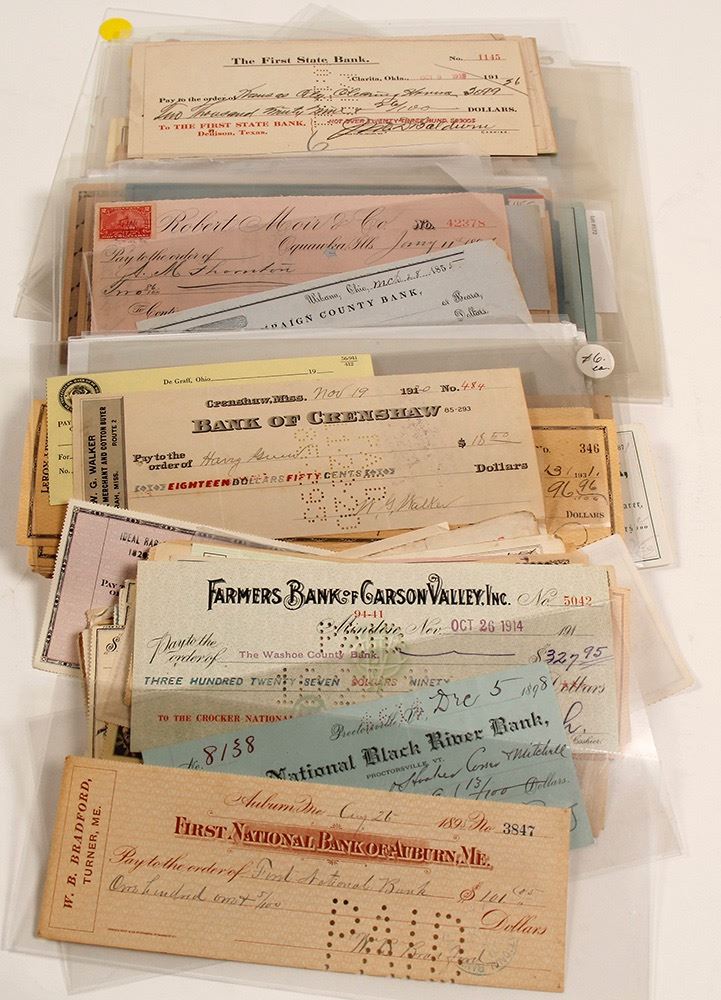 Dozens of checks from KS, NY, IN, PA, AL, IA, MT, ND, OR and more. Some pictorial, some 19th Century. Date: Location: HWAC# 57245