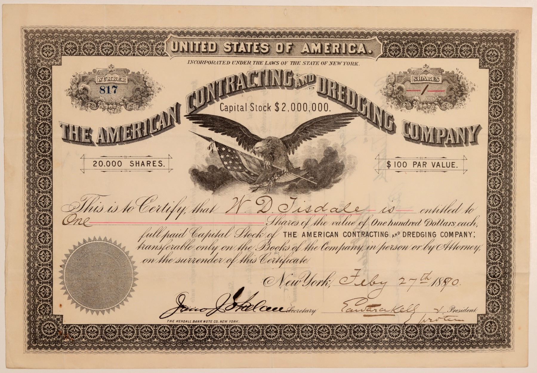 Inc. in New York. No. 817, issued for one share to WD Tisdale on Feb 27th, 1890. Signed by the pro-term president and the secretary. Not cancelled. Black border and print, eagle on flag vignette. Printed by the Kendall Bank Note Co., New York. Folds, pinholes, rust stain on reverse. 8 x 11.75" According to the Transactions of the Canadian Society of Civil Engineers, Volumes 3-4 (1890), this company was one of the firms doing work on the construction of the Panama Canal! An 1883 article in Engineering News and American Contract Journal notes that the company is working on the section of the canal between Colon and Gatun (a distance of 7 miles). City: State: Panama Date: 1890