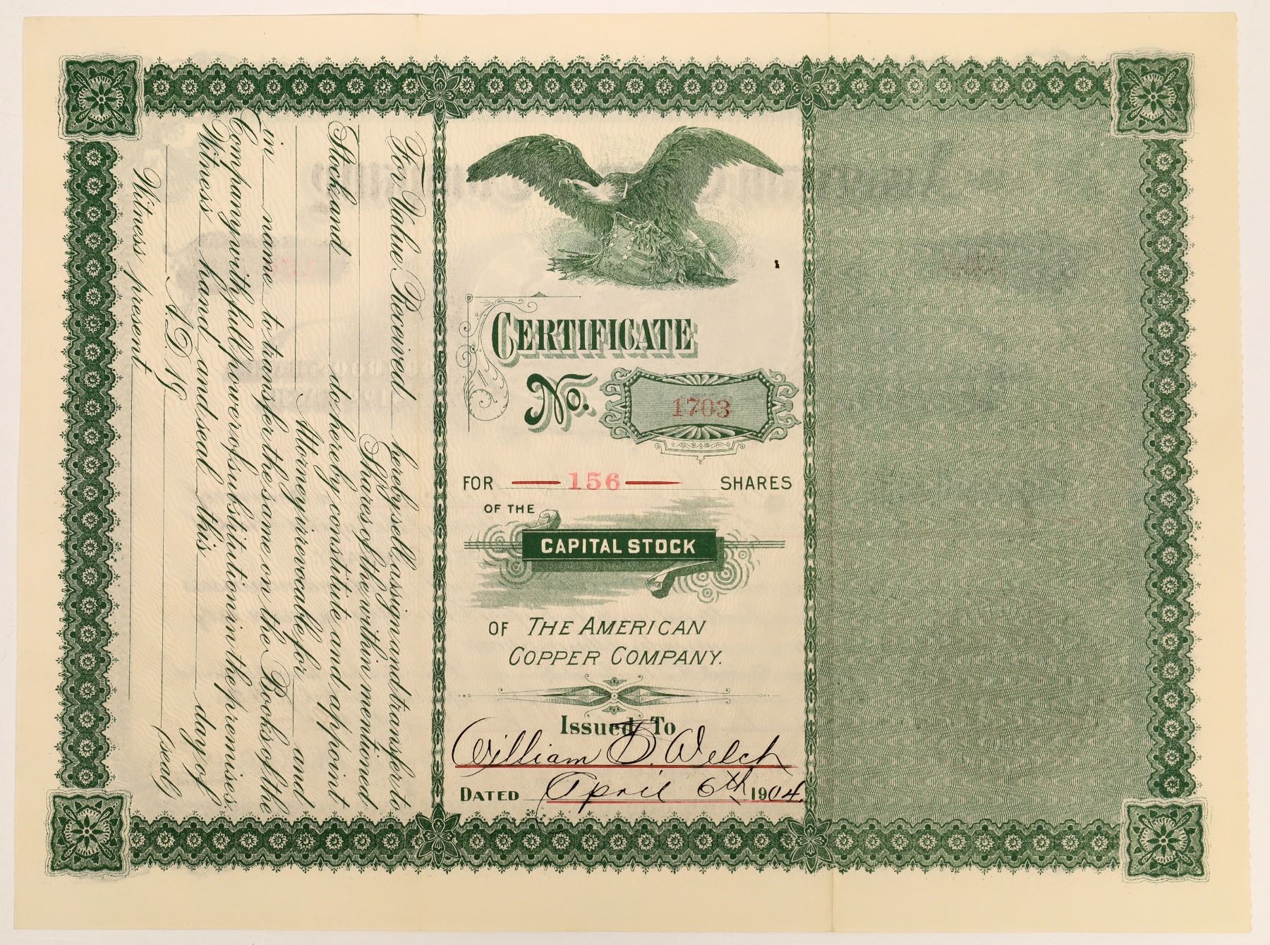 Yavapai, Big Bug. No 1703 for 156 shares issued to William B Welch in 1904. Signed by JK Burnham as president and A. S. Kinberly as secretary. 9x12 green border with gold seal and saftey print. printed not noted. Owned 20 claims including the Iron King in the Big Bug district.