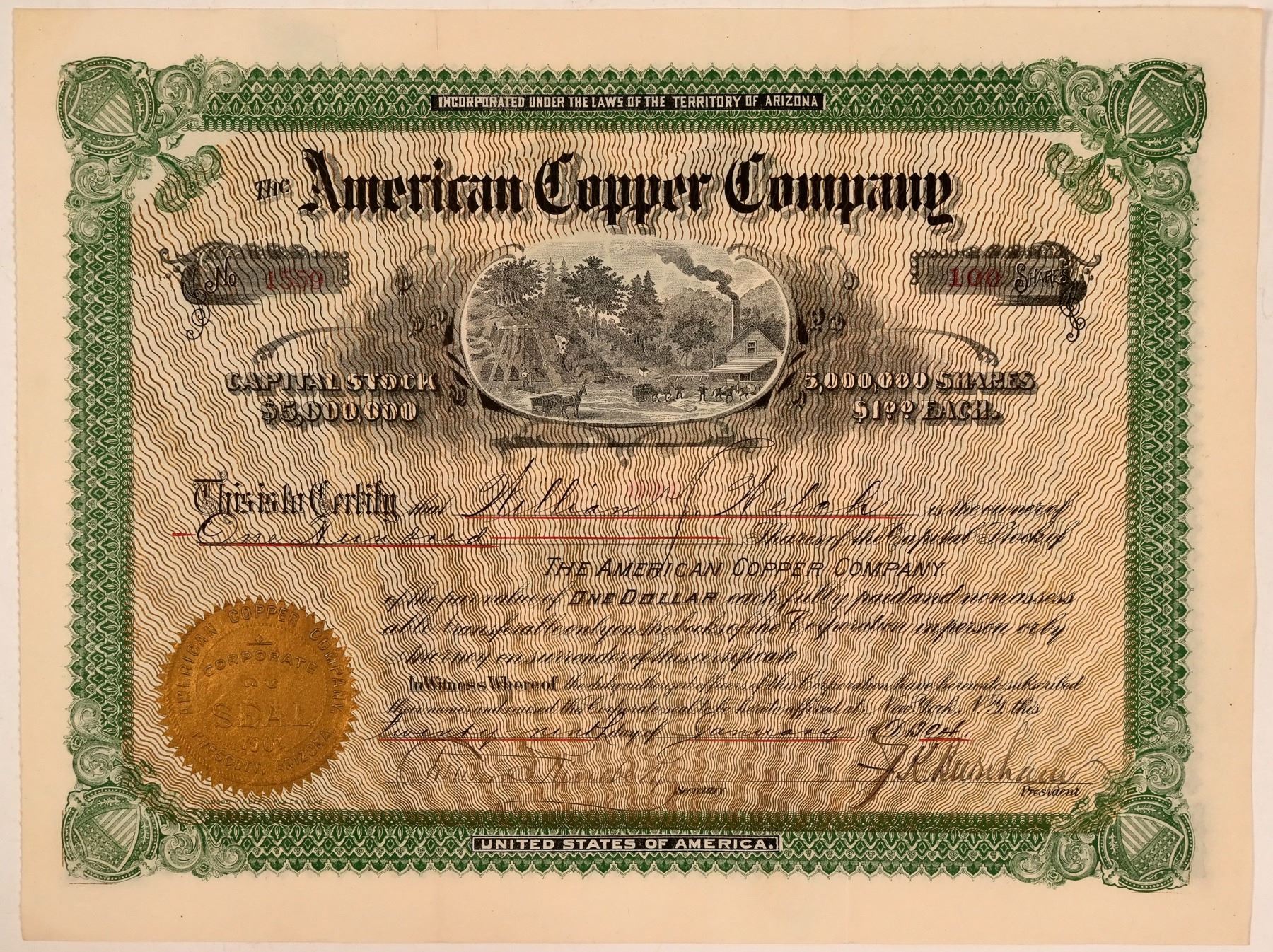 Operated in the Big Bug District, Yavapai County, Arizona. Inc. in Prescott, Arizona, 1901. No. 1559, issued for 100 shares to William Welch on January 29th, 1904. Signed by president Burcham and the secretary. Not cancelled. Gorgeous design with green border, gold seal, black print, and mining vignette. Folds, light wear. 9 x 12"