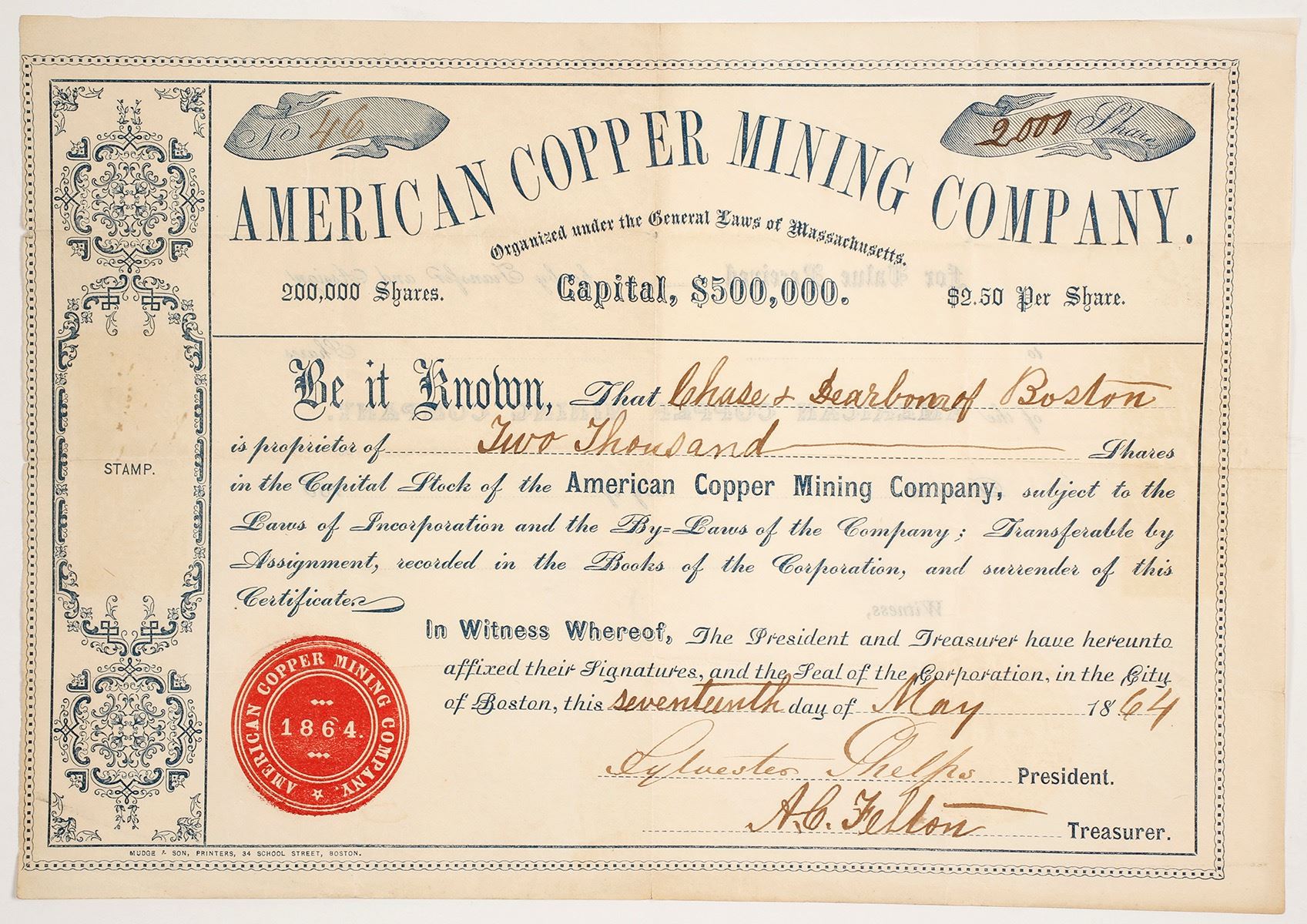 Inc. in Massachusetts.No. 46, issued for 2,000 shares to Chase & Dearborn of Boston on May 17th, 1864. Signed by president Sylvester Phelps and treasurer A.C. Felton. Not cancelled. Blue print, red seal. Deep folds, some toning. 6.25 x 9" According to an 1864 prospectus, the company owned 200 acres in Brome and Sutton, Canada East. Property is adjacent to Brome Mining Company and the Sutton Mine on the other side. Trial pits have been dug 700 feet along the vein, which is 5-10 feet in width. Date: Location: Quebec, zCanada HWAC# 62758