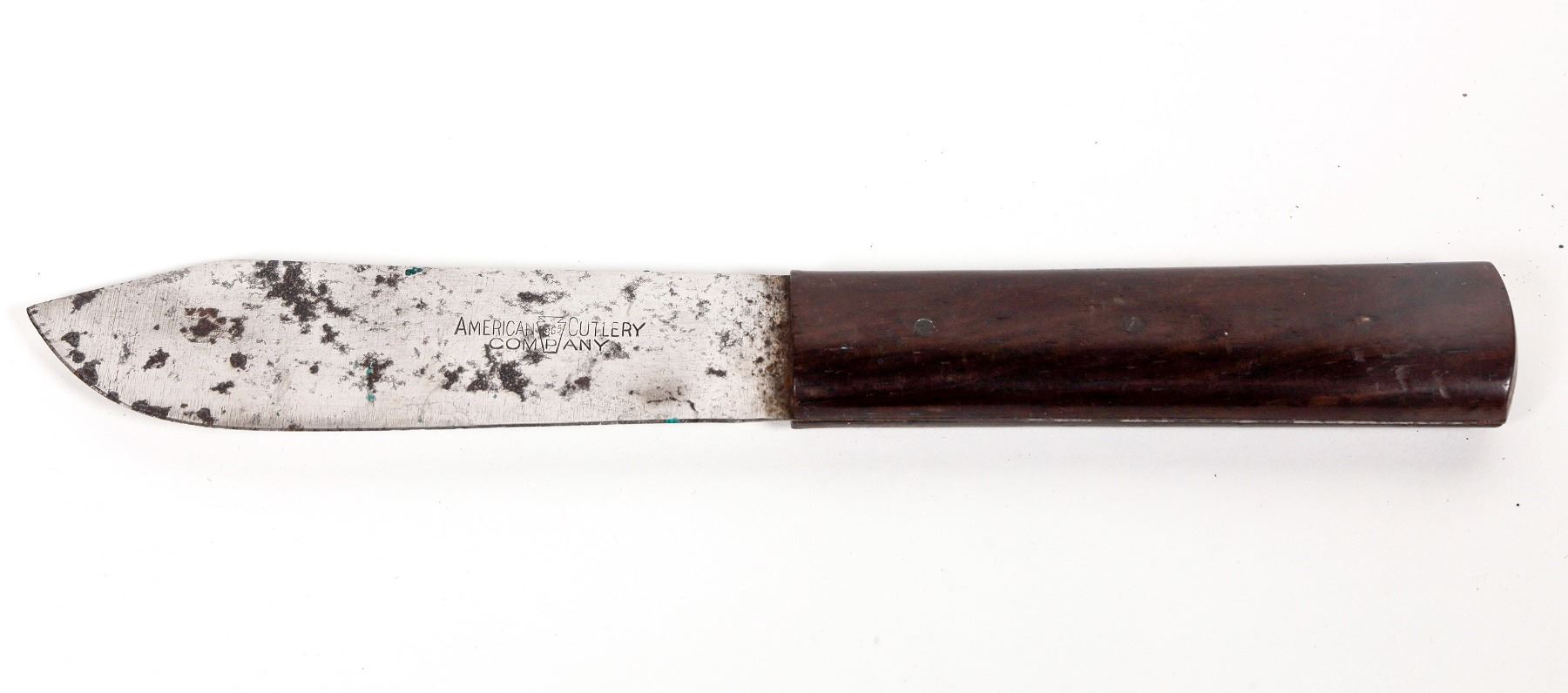 This butcher knife made by the American Cutlery Co. of Chicago is 9 in. overall length with a 4.75 in. blade and 4.5 in. of cocobolo scales held by three pins. "American Cutlery/ Company" with the keystone logo "1865". The cocobolo scales are without chips the blade is lightly used. In very good condition. Likely made in the 1920's. Please see photos for details.