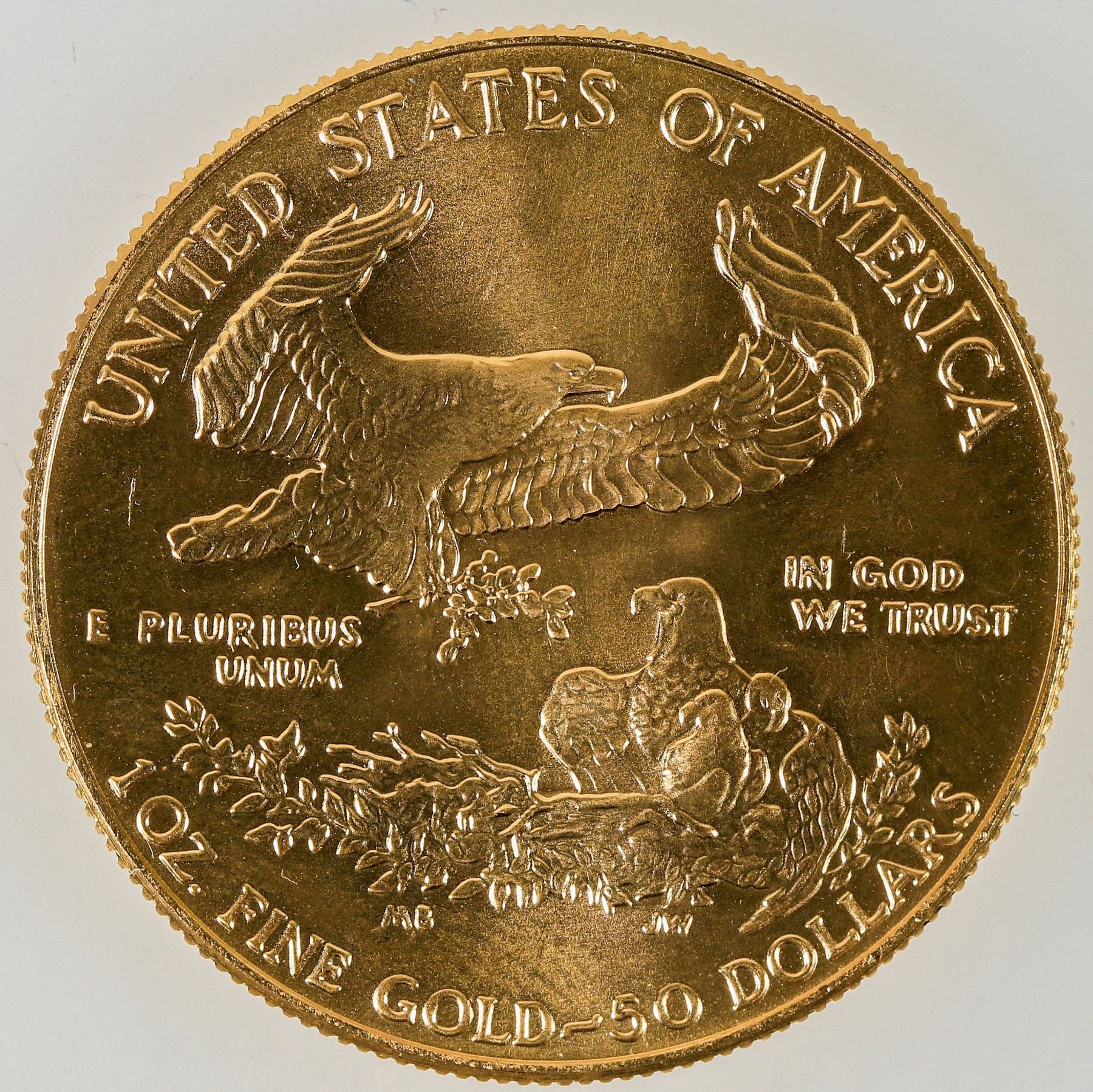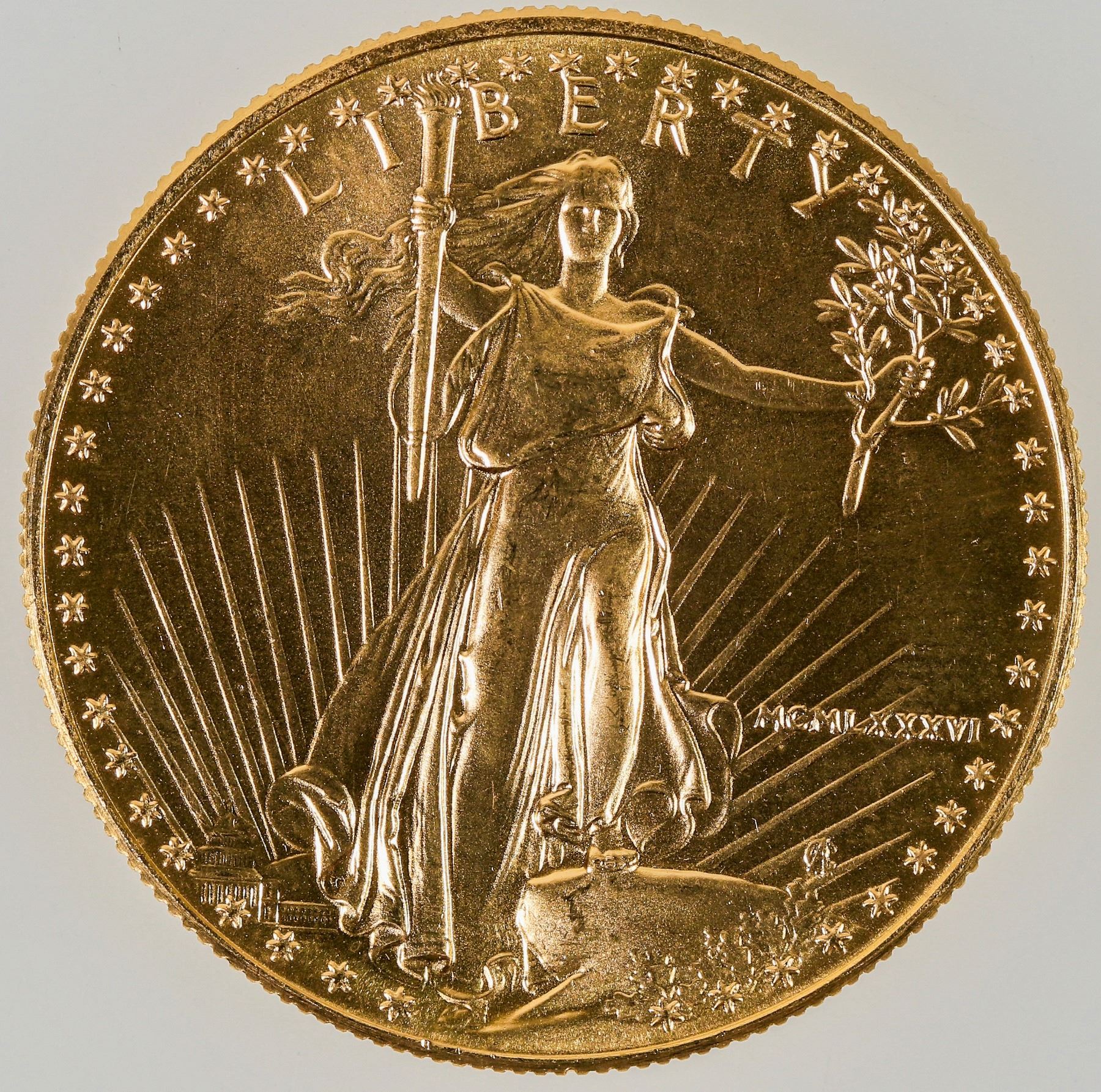Brilliant uncirculated one ounce American Eagle $50 gold piece, dated with Roman numerals 1986, mintage 1,362,650. First year of issue.