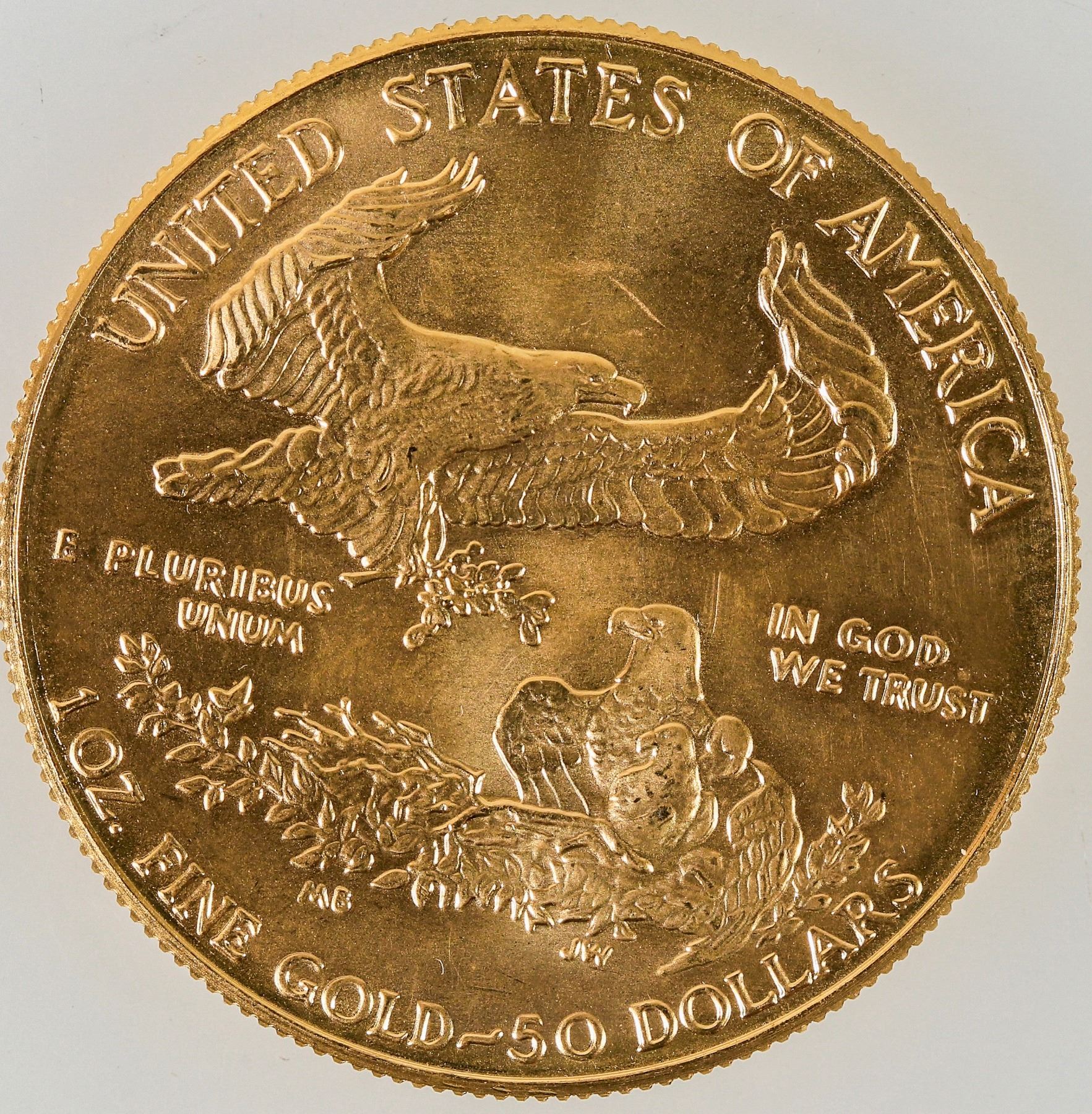 Brilliant uncirculated one ounce American Eagle $50 gold piece, dated with Roman numerals 1986, mintage 1,362,650. First year of issue.