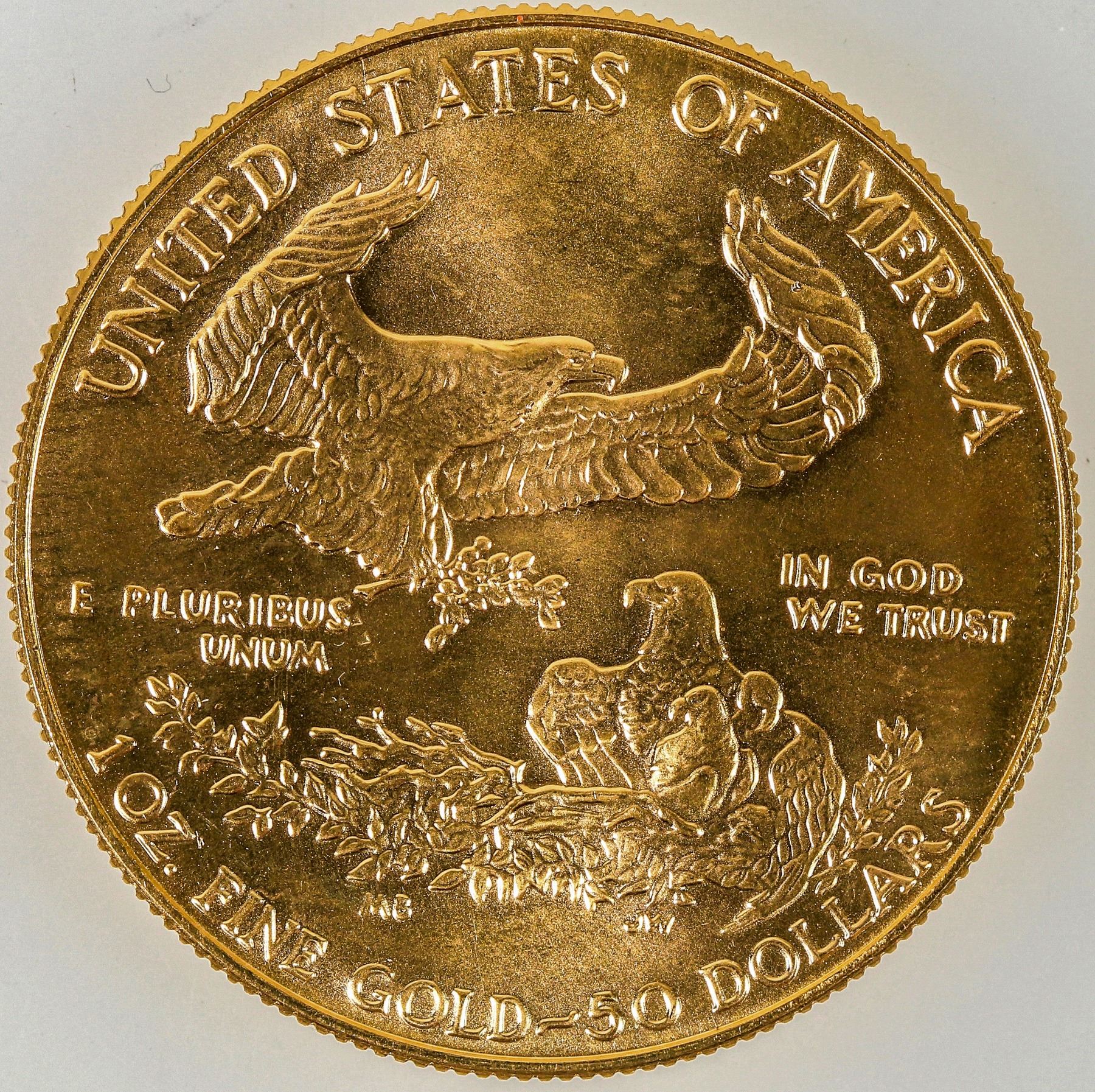 Brilliant uncirculated one ounce American Eagle $50 gold piece, dated with Roman numerals 1987, mintage: 1, 045,500; second year of issue.