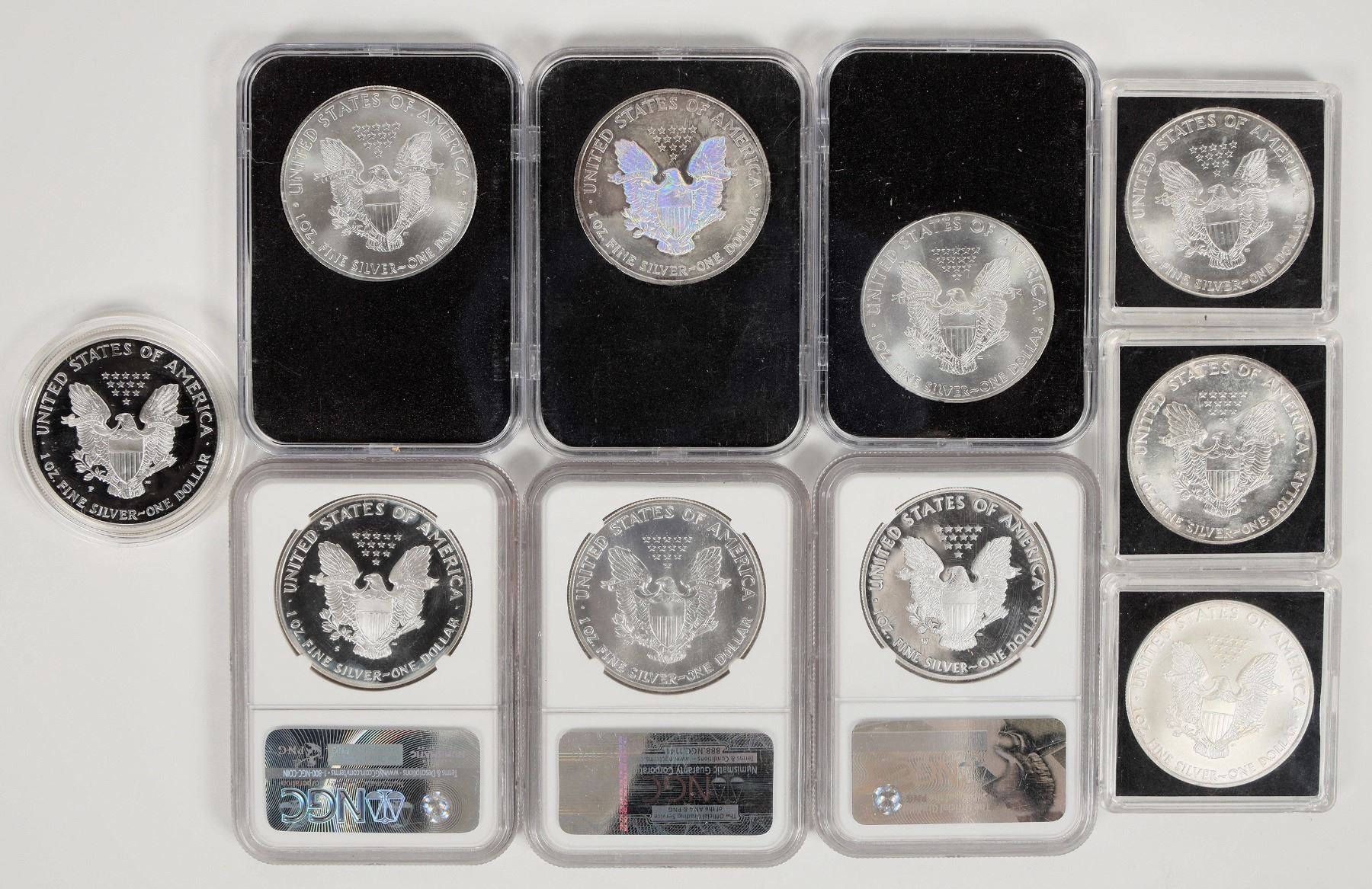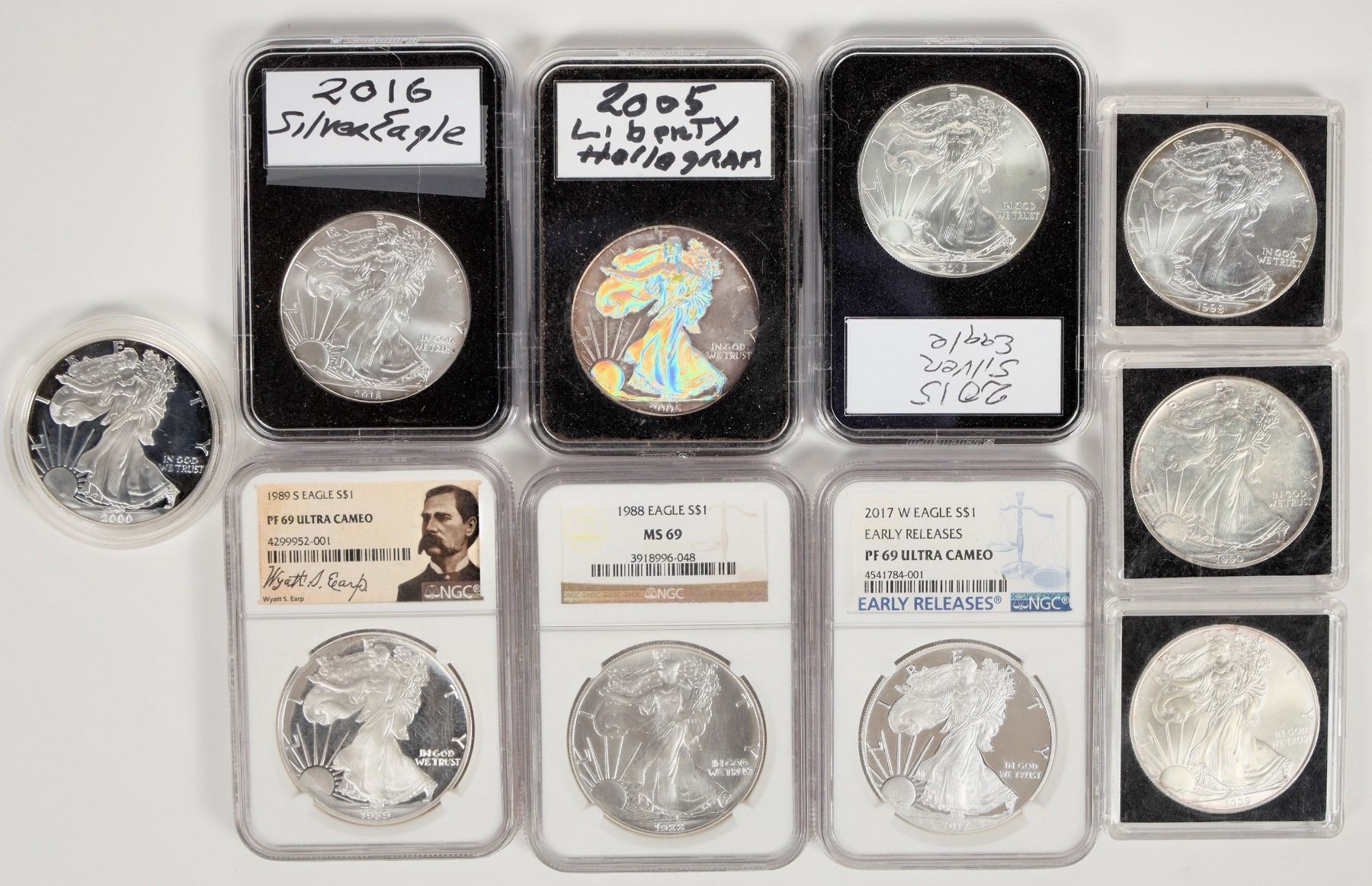 Ten different date American Eagle silver dollars: 1988 NGC MS 69; 1989-S NGC PF 69 Ultra Cameo Wyatt Earp issue; 1990 Unc; 1998 Unc.; 2000 proof in original case and box; 2005 Unc. hologram; 2009 Unc; 2015 Unc.; 2016 Unc.; 2017-W NGC PF 69 Ultra Cameo Early Release.