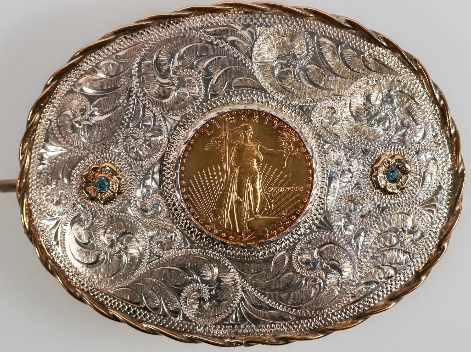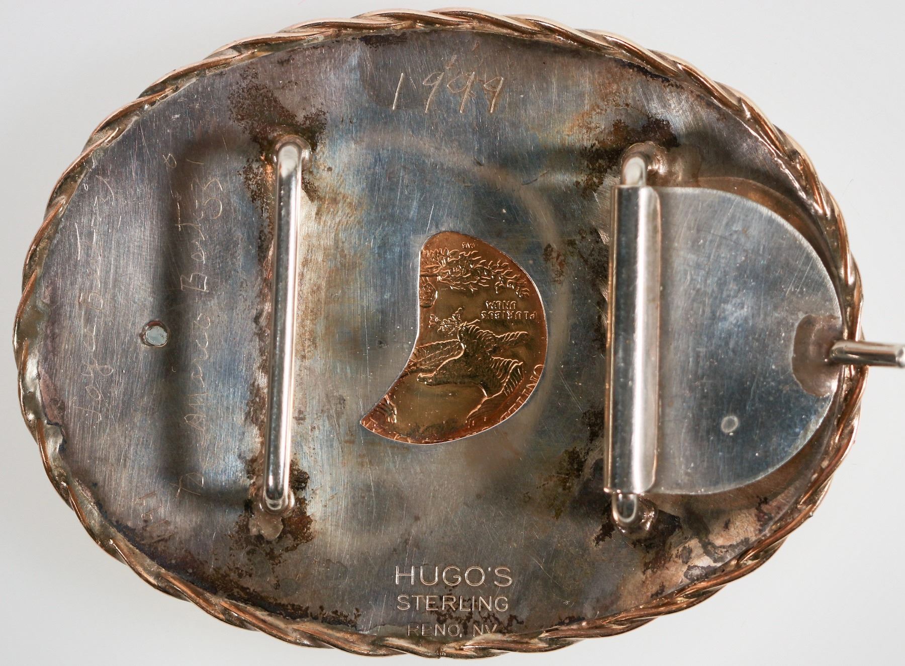Stamped Hugo's Sterling Reno, NV. 4 x 3 inch belt buckle with a one ounce American Eagle gold piece dated 1989 in roman numerals; flanked by two blue zircons, gold trim. Will fit up to an 1 1/2 inch belt.