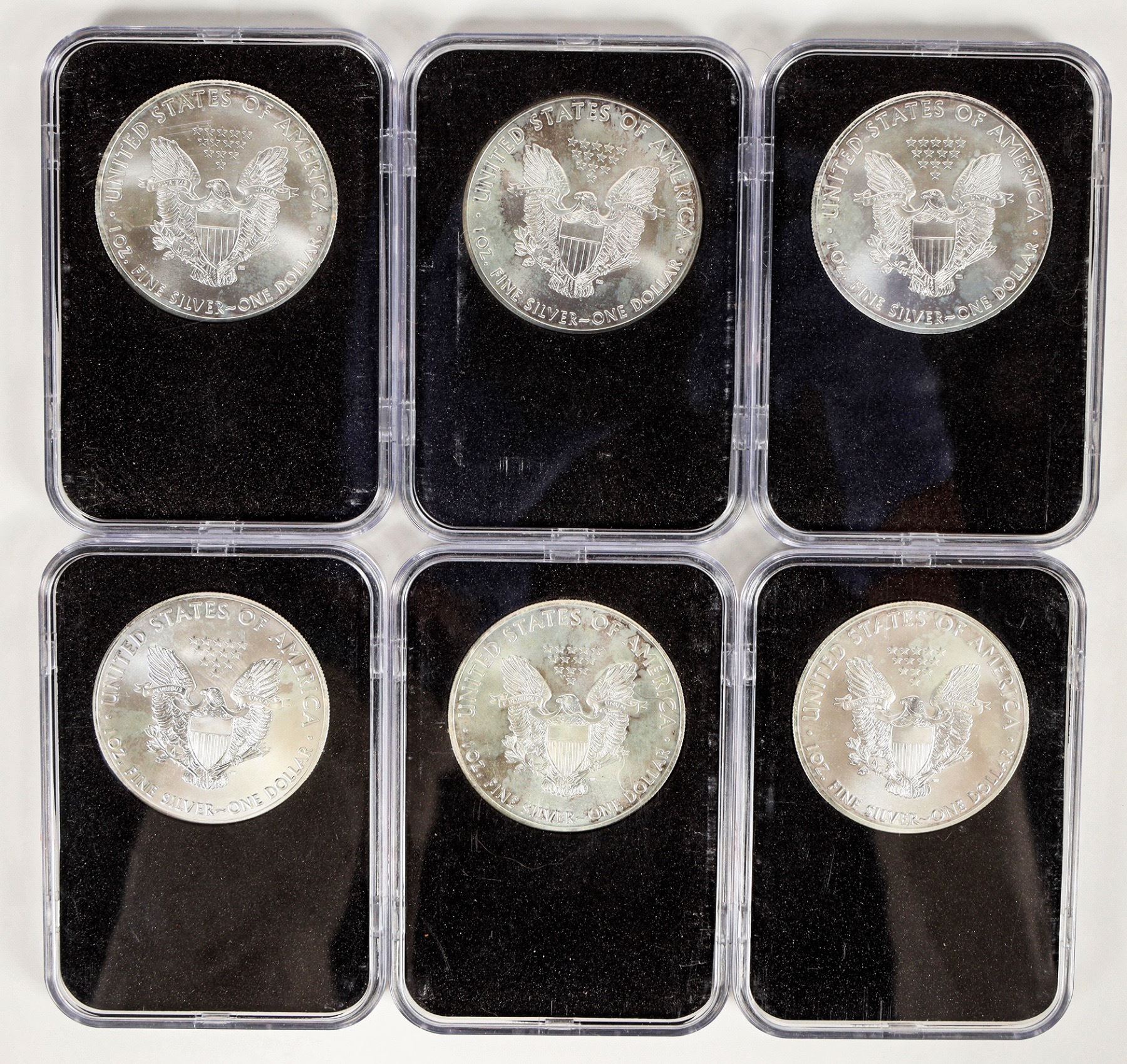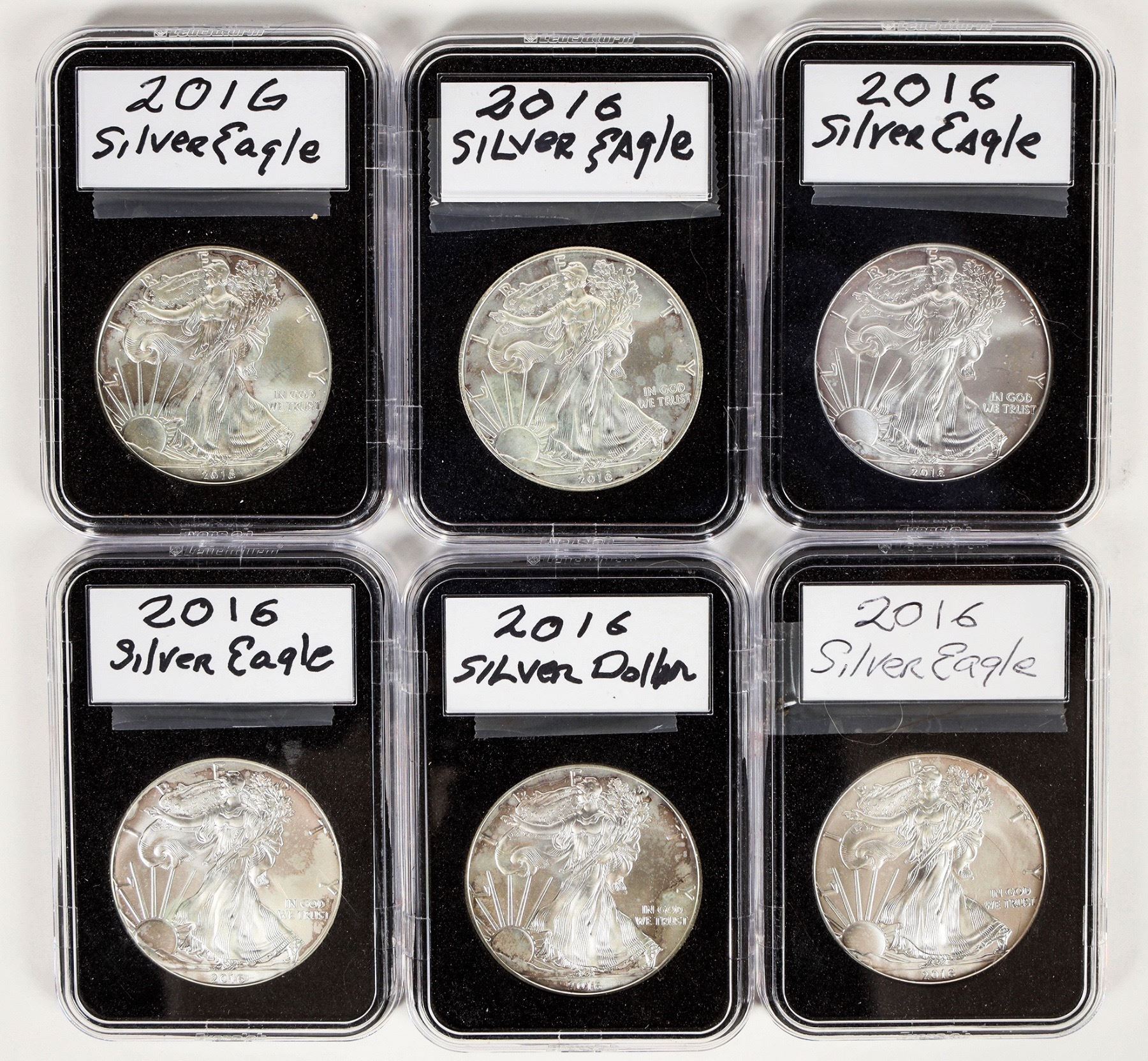 Six brilliant uncirculated 2016 American Eagle silver dollars in hard plastic cases.