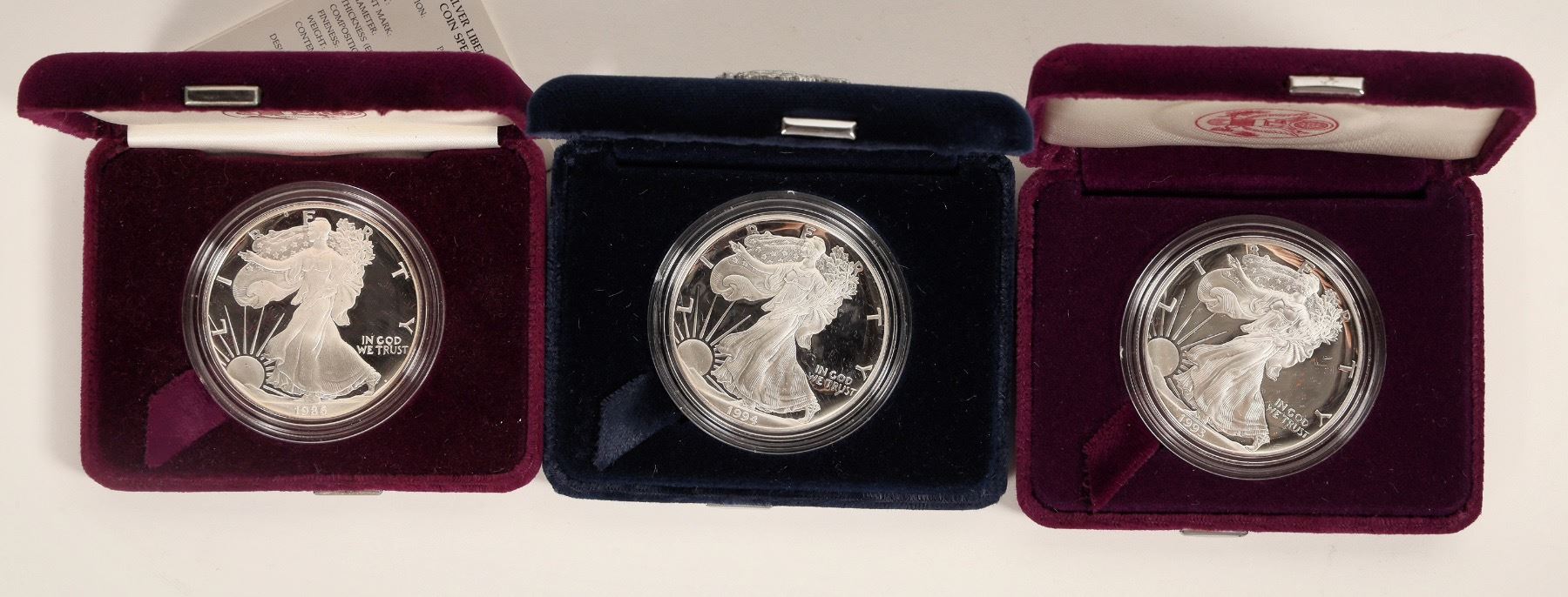 In original mint packaging: three proof American Eagle silver dollars: 1986, 1993, 1994.[