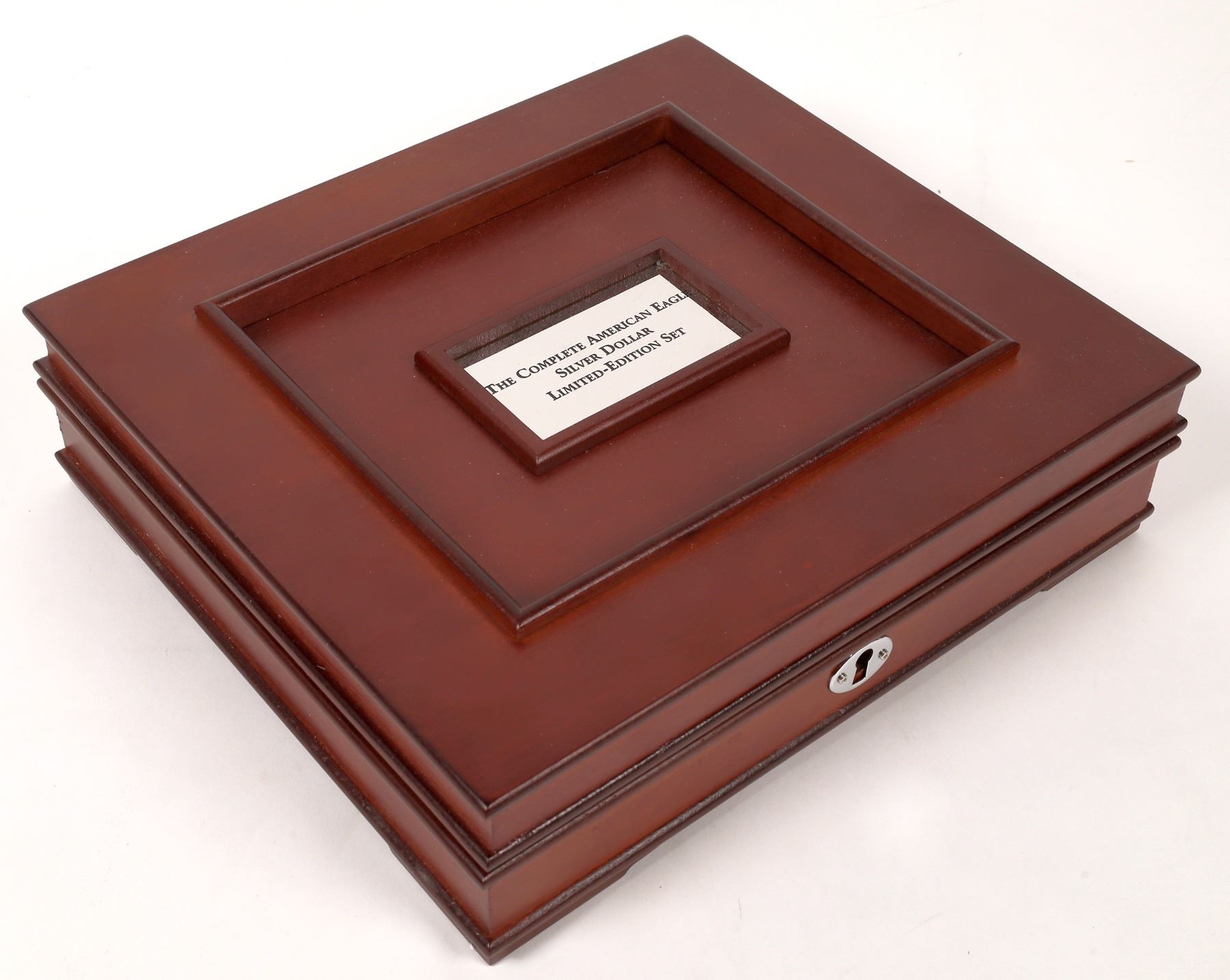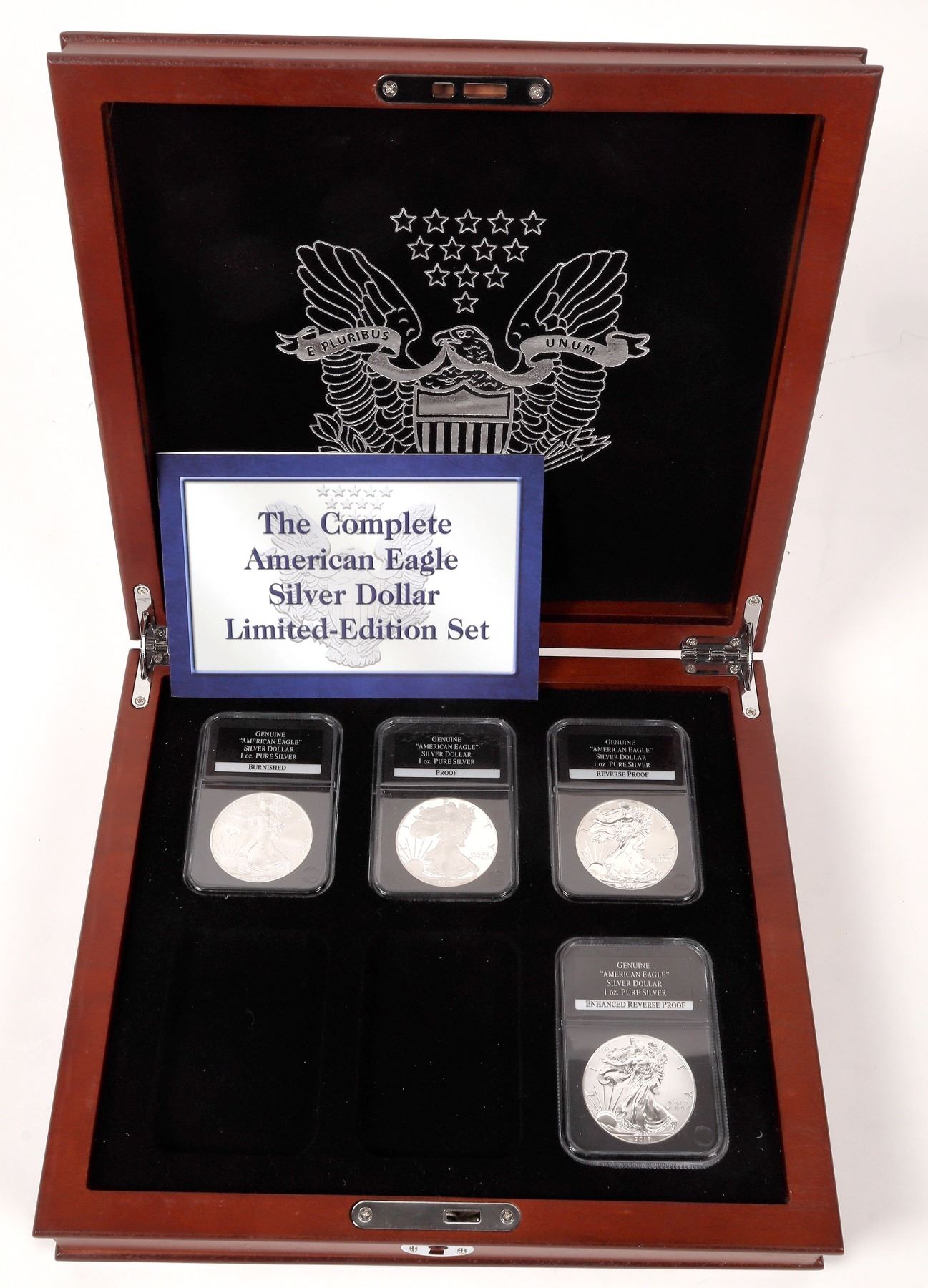 Issued by PCS Stamps and Coins, a wooden case (11 x 10 x 3 inches) containing four slabbed silver eagles, three proof, one burnished. Room for two more in the case.
