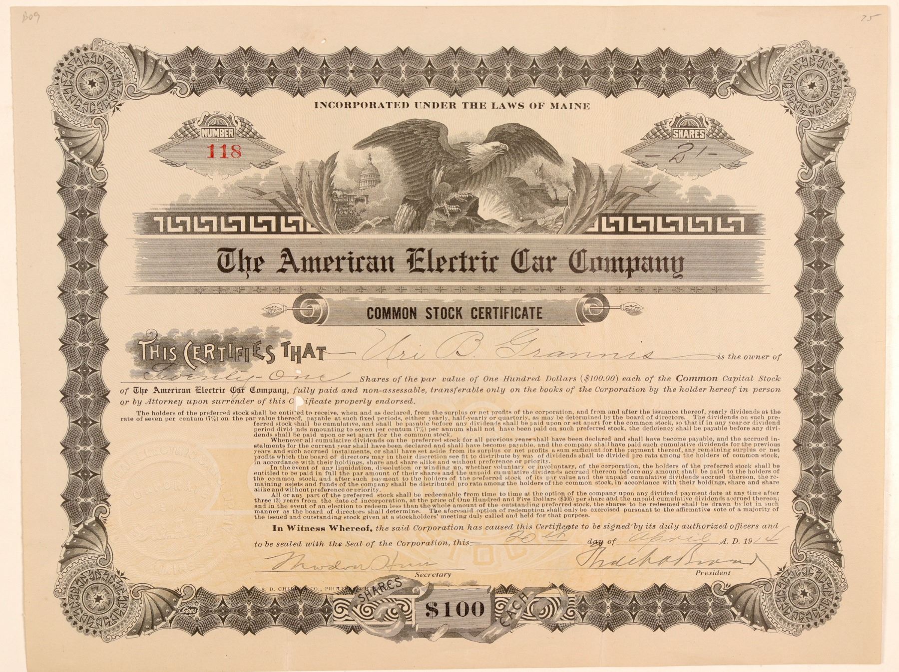 Inc. in Maine. No. 118, issued for 21 shares to Uri N. Grannis on April 20th, 1914. Signed by the president and secretary. Not cancelled. Black border and print, eagle vignette. Folds, some holes along the folds. 8.25 x 10.75" This company was the 1914 consolidation of The Argo Electric Vehicle Company, Broc, and Borland electric vehicle companies. The company marketed three different models. In 1916 the Columbia Motors Company purchased the assets of Argo. Ken Prag Collection