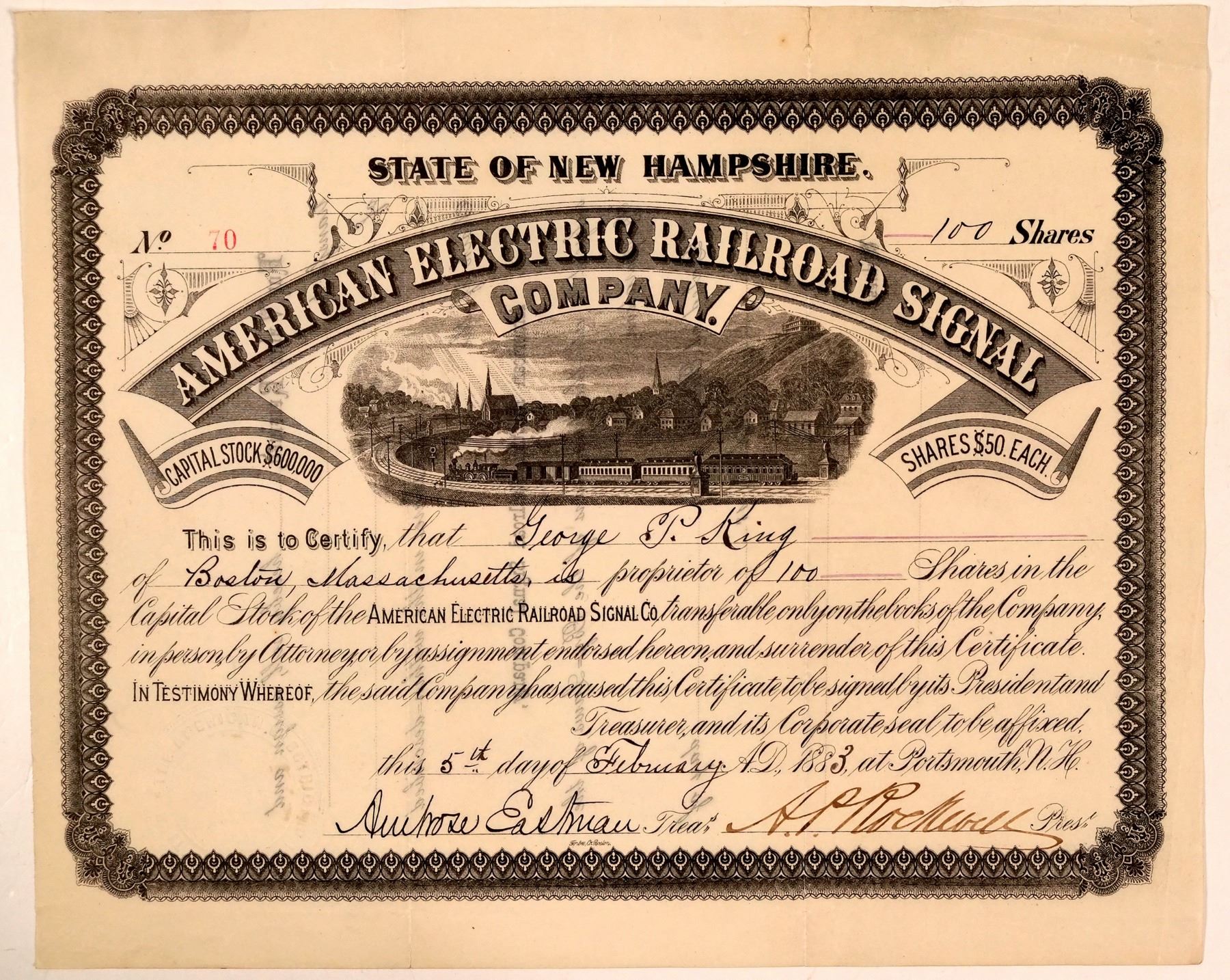 Very attractive cert. #70, issued for 100 shares at Portsmouth, N.H. Large vignette of a train circling a small hamlet. Shares were $50 each. Total capital $600,000. Not listed in Cox. The company produced and automatic electric crossing signal. Uncancelled.