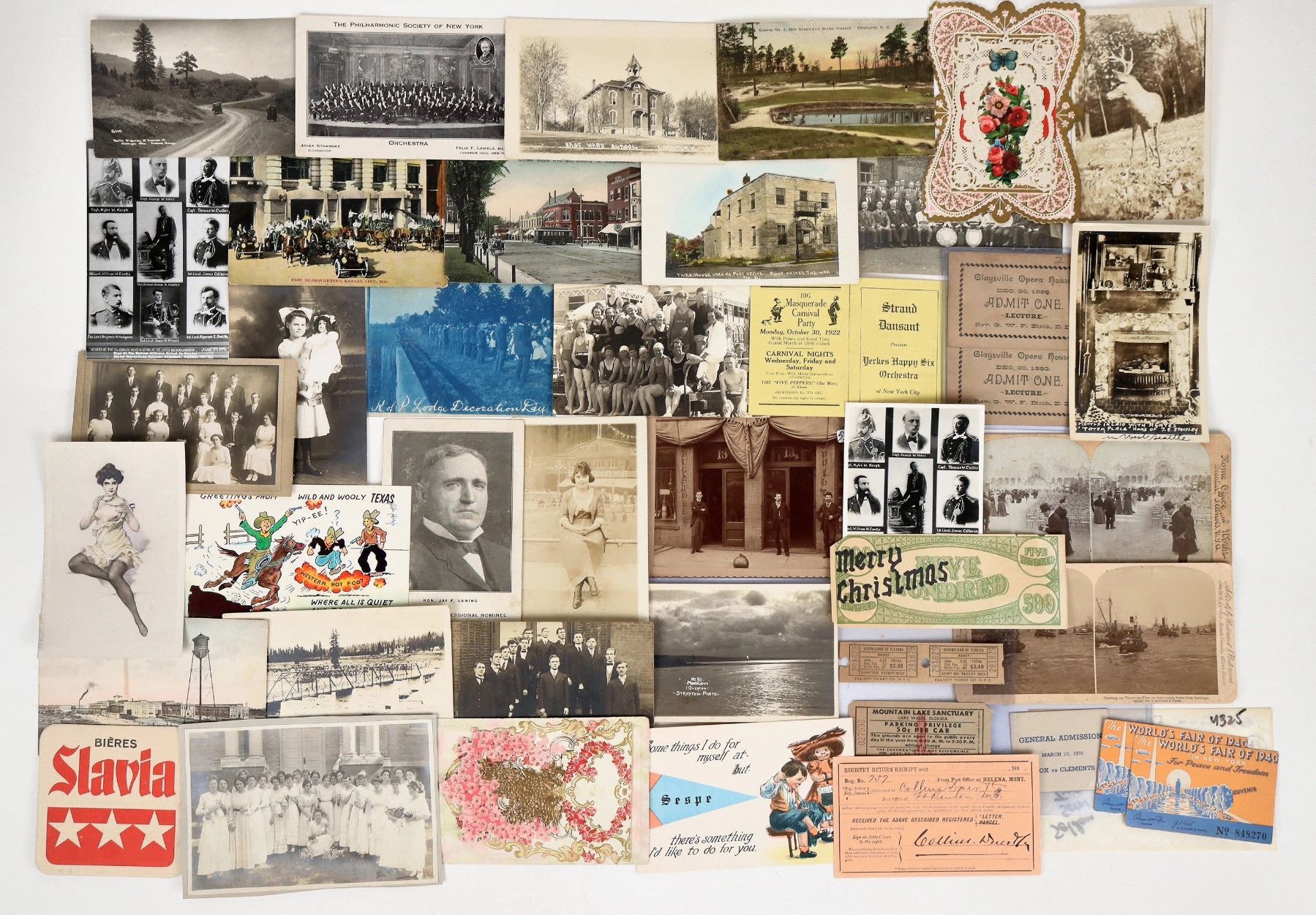 End of the day sorting grab bag of US ephemera. About 45 items Postcards with RPC's and risqué, 1940 Worlds Fair ticket stub, photos, seldom seen Mountain Lake Sanctuary parking ticket, stereoviews and more! See photo.