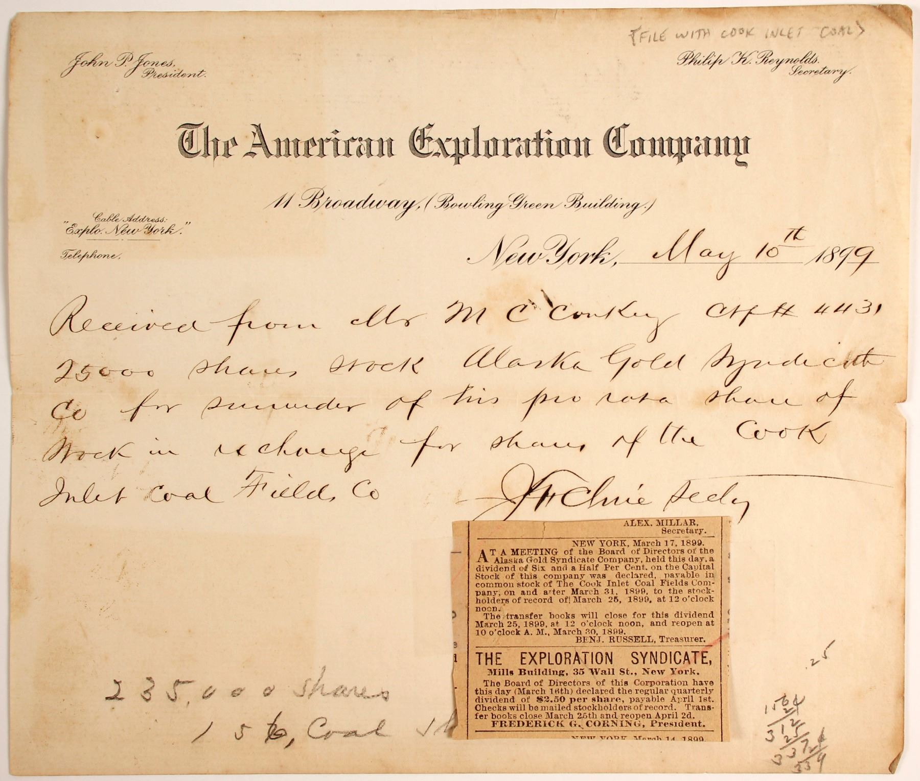 THis 1899 billhead is during the height of the Alaska GOld Rush. It communicates that Mr. McConkey has sent certificate # 4431 from the Alaska Gold Syndicate for surrender for shares in the Cook Inlet Coal Field. Signed by secretary JH Cluie(?). Includes a newspaper ad with information. Although not a stock, this company is not found in Hanscom. Prag Collection City: Cook Inlet State: Alaska Date: 1899 HWAC# 78604
