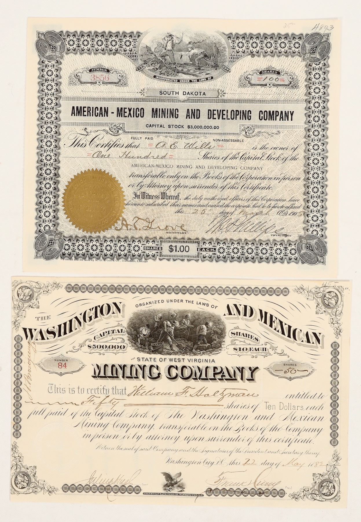 Issued-1905 American-Mexico Mining and 1882 Washington and Mexican Mining stocks. Both with mining vignettes.[ Mexico