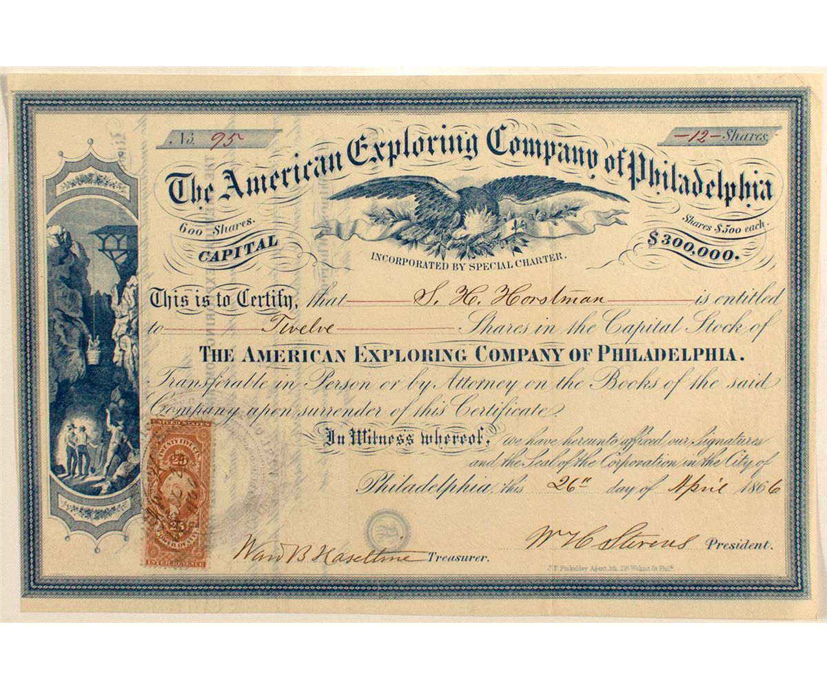 Inc. Feb 5, 1866 by special charter. No. 95. Issued for 12 shares to S.H. Horstman in Philadelphia on April 26th, 1866. Signed by W. H. Stevens (president) and Warr. B. Haseltine (treasurer). Blue lettering. Vignette of a mining tunnel and a bucket hoist (left). Vignette of an eagle (top center). Twenty-five cent revenue stamp attached at left. Reverse not endorsed. Printed by J.F. Finkeldsy, Philadelphia. Measures 10" x 6 3/4"City: County: State: CODate: