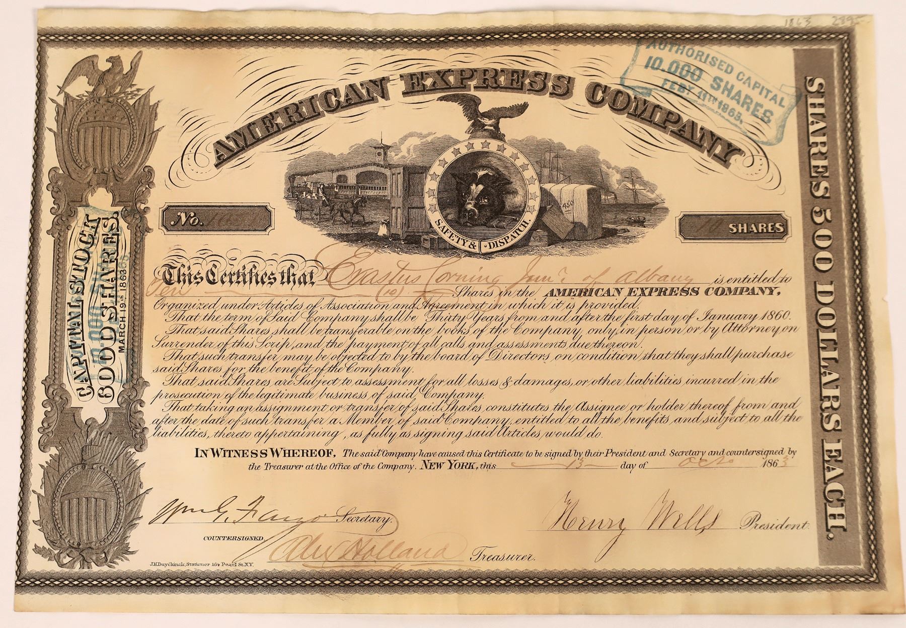 Two key Western express autographs. No. 1051, issued to Erastus Corning Jr. of Albany for ten shares on Oct. 13th, 1863. Signed by Henry Wells as president, William Fargo as secretary, and Alex Holland as treasurer. Not cancelled. Black border and print, with vignette of wagon, ships, and packages. Also circular vignette of dog. Printed by JH Duyckinck, NY. Folds, wrinkles, heavy toning. 8.25 x 12" Wells, Fargo and Butterfield were the three founders of the company in the 1850s. Wells & Fargo teamed up to form Wells Fargo, a separate company that would offer express service in California and the West. Erastus Corning Jr. was the son of Erastus Corning, a banker, railroad developer, iron merchant, and New York politician (and namesake for the town of Corning). Jr. was also very successful. He founded the St. Agnes School and the Children's Hospital and established the Corning Foundation for Christian Work in Albany. He was president of the Albany Iron Works, two banks, and the Albany Cemetery Association and was a director of the New York Central and Hudson River Railroad.