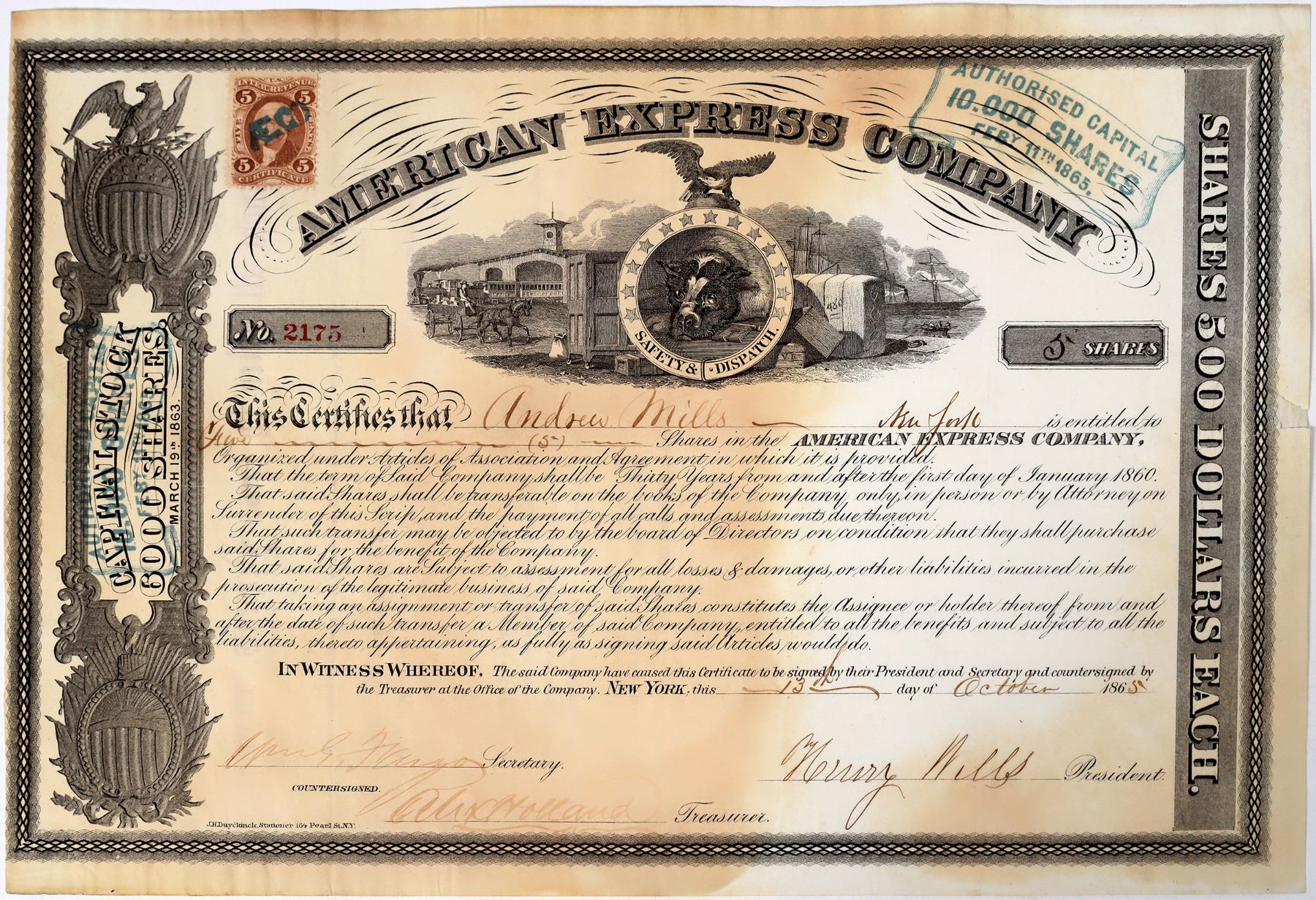American Express Co. stock issued 1865 to Andrew Mills, signed by President Henry Wells, William Fargo, and Alex Holland. 5c tax stamp. 2 1" tears on right side. Brown toning on 50+%.