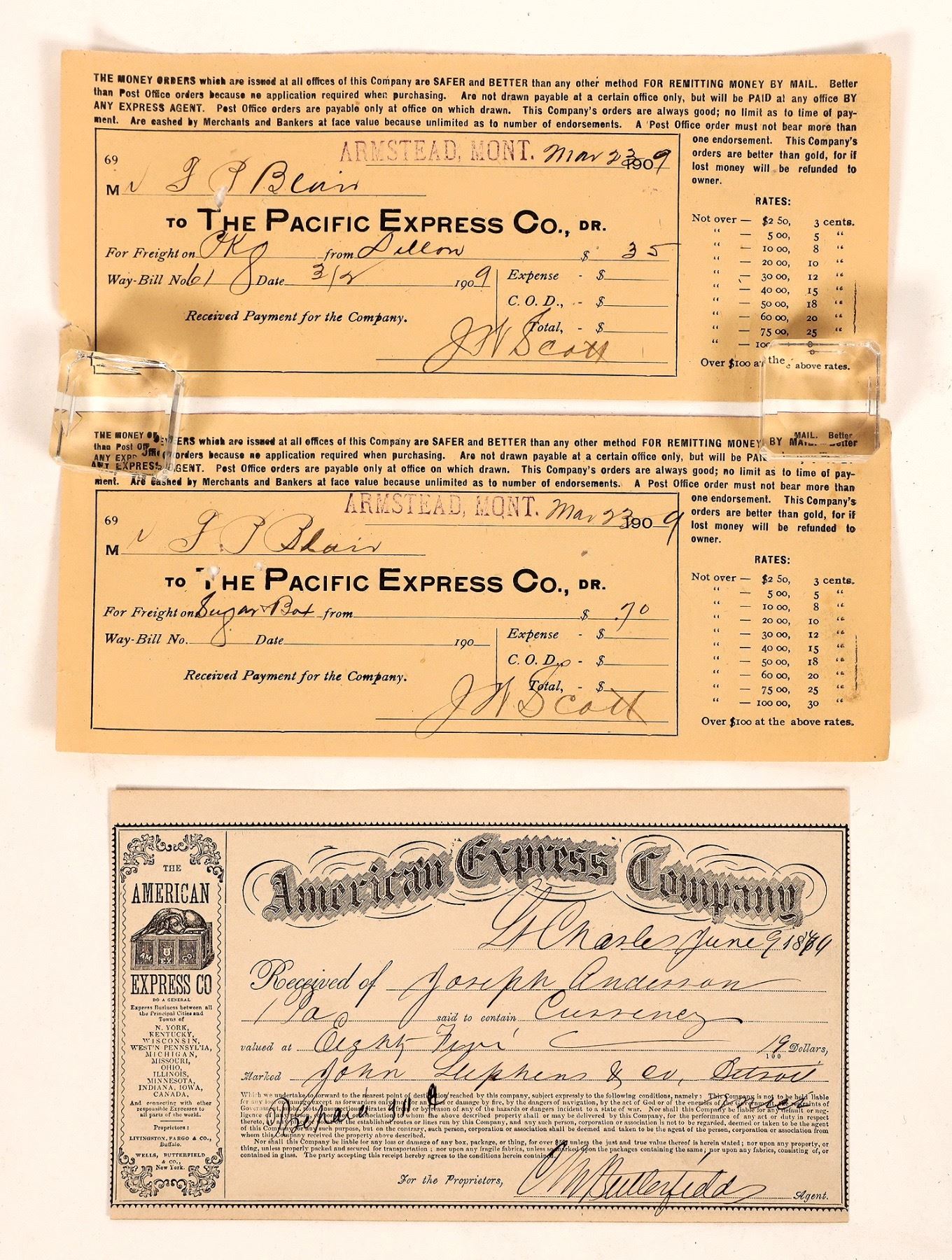 2x 1909 Pacific Express receipts and 1879 American Express Company receipt signed by one of the Butterfields, whose company merged with American Express.