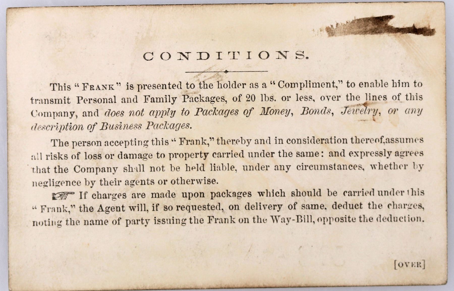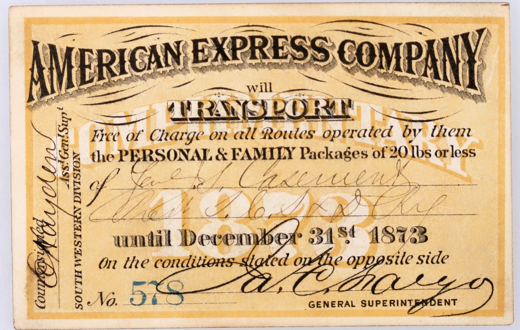 Rare and early. Pass no. 578, issued for the year 1873 to Casement. Preprinted signature of James C. Fargo. Countersigned by asst. superintendent Hayden. Black print, white underprint, and yellow background. For transport of packages of 20 lbs. or less.