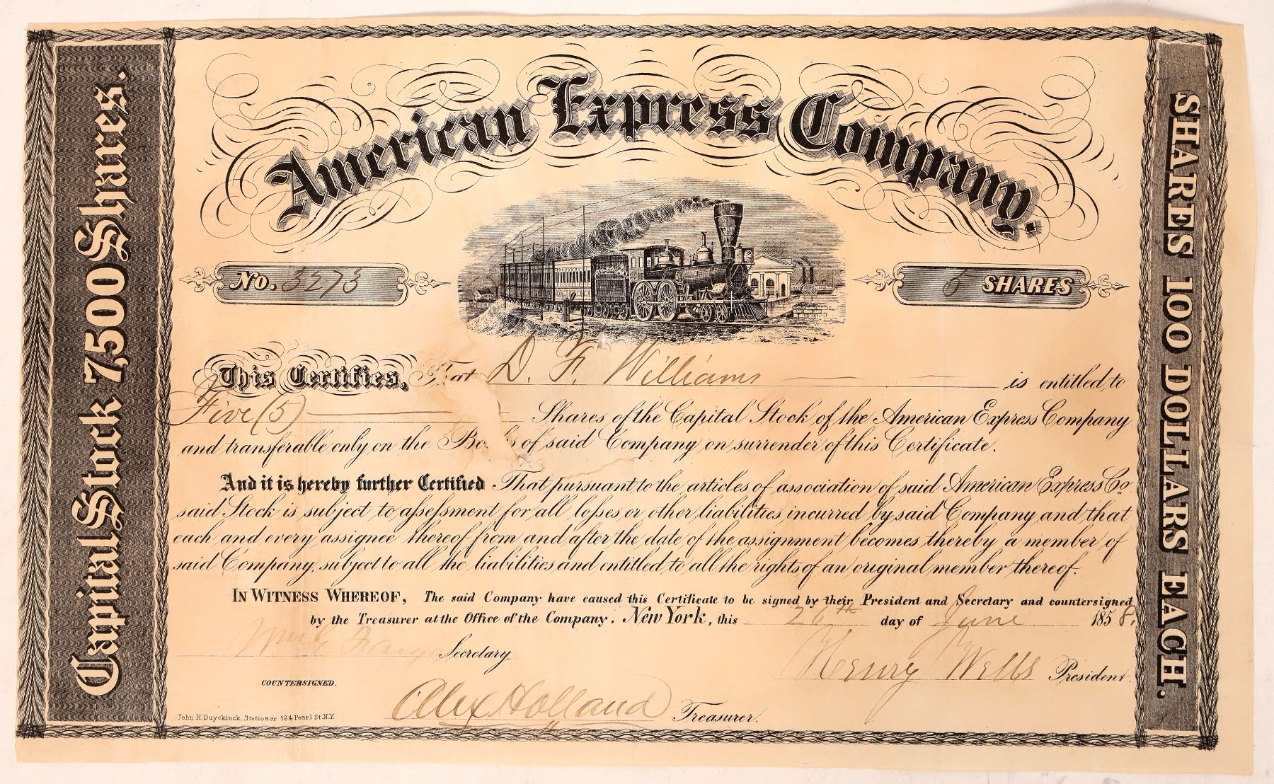 American Express Company stock certificate, No. 3273, 5 shares issued at 100 dollars each, to D. Williams. Signed on June 26th, 1858 by William G. Fargo, the secretary, and Henry Wells, the president and one of the founders of American express company, as well as Wells Fargo & Company. Henry Wells was the president of the company from 1850 since its foundation and retired in 1868. The certificate has an ornate black border and a train vignette at the top. Not cancelled. Very fine condition. 11 x 7.5 inches. New York