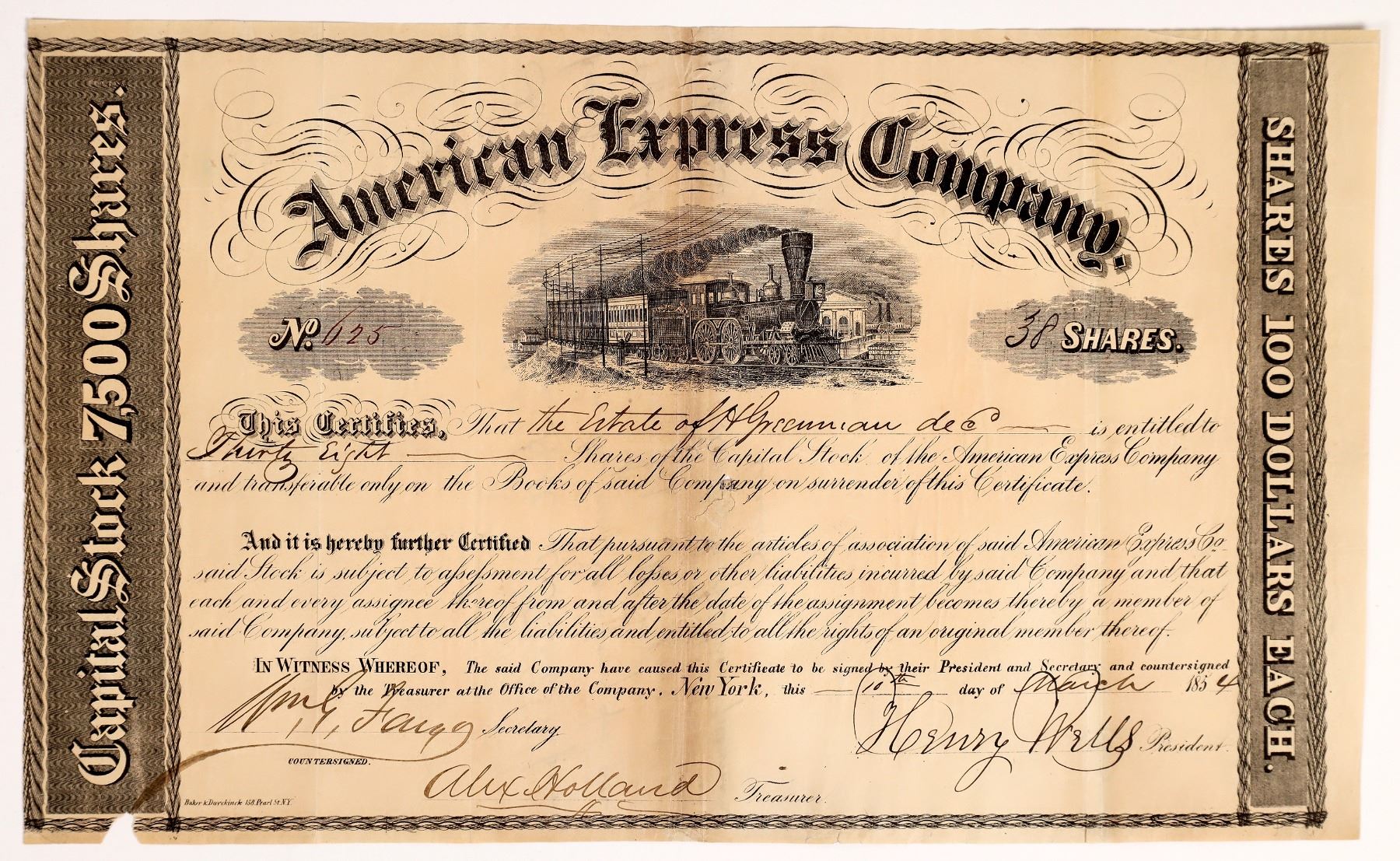 Very early! Type 2a certificate (see Fred Holabird's Essay about this company and the stock varieties, available on holabirdamericana.com) No. 625, issued for 38 shares to the Estate of H. Greenman in 1854. Signed by Henry Wells as president, William G. Fargo as secretary, and Alex Holland as treasurer. Not cancelled. Black border and print, with locomotive and telegraph pole vignette. Capital Stock 7,500 shares. Printed by Baker & Duyckink, NY. Folds, areas of heavy toning, pinholes. 6.5 x 10.5" Hiriam Greenman, along with John Butterfield and others ran a line of packet boats on the Erie Canal. Wells and Fargo are two of the 3 founders of American Express (along with Butterfield) and also founded Wells, Fargo, & Company.