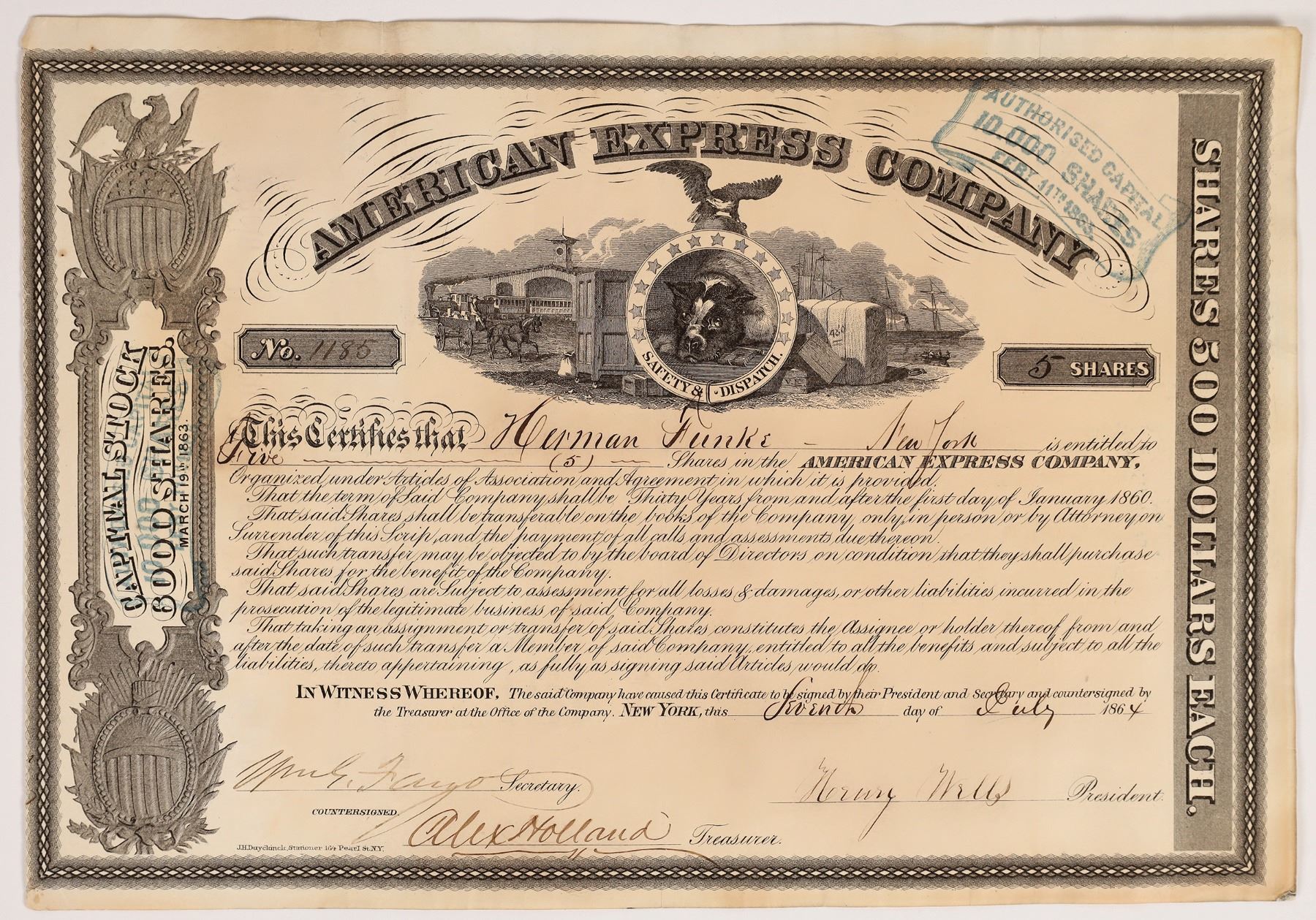 No. 1135, issued for 5 shares to Herman Funke in July 1864. Signed by Henry Wells as president, William Fargo as secretary, and Alex Holland as treasurer. Not cancelled. Safety & Dispatch vignette. Preprinted 6,000 shares, March 19th, 1863 with blue stamp "Authorized Capital 10,000 Shares, Feby 11th, 1865." Why did they stamp this stock later? Printed by Duyckinck. Folds, wrinkles, stains. 8.5 x 12" Wells and Fargo were 2 of the 3 founders of American Express (along with John Butterfield). They also founded Wells, Fargo & Company. Please see Fred Holabird's essay about the history of American Express and the stock varieties, available on holabirdamericana.com.