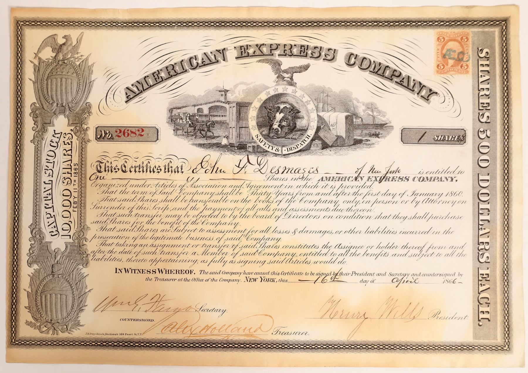 This certificate is unique in the Prag collection and is the preprinted capital stock 10,000 shares February 11, 1865 imprint. This is certificate 268241 share issued to John F Dessmasses of New York on April 16, 1866. Signed by Henry Wells, William Fargo, and Alex Holland. This is a rare variety.