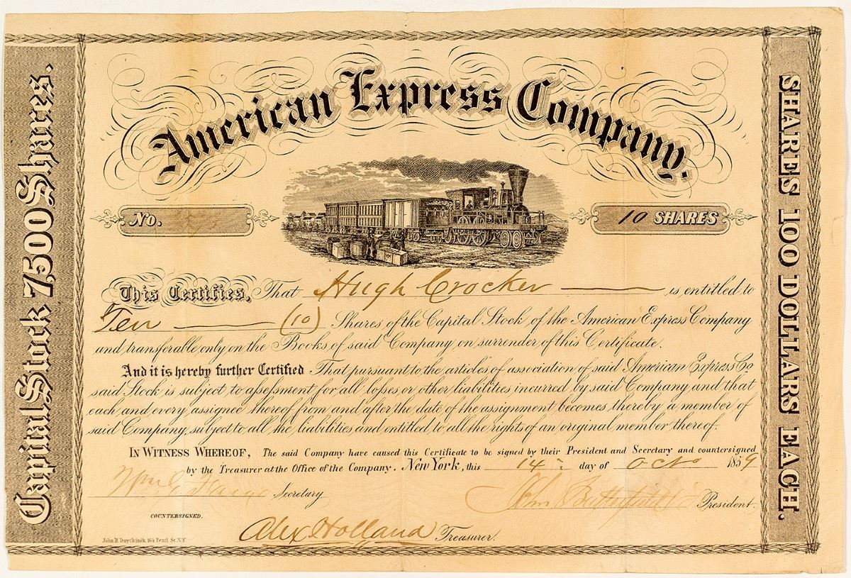 American Express Company, no. 573 for 10 shares to Hugh Crocker on October 14, 1859. Signed by Fargo, Butterfield, and Holland. Certificate number is difficult to read. (Prag collection) City: State: New York Date: 1859 ID# 33059