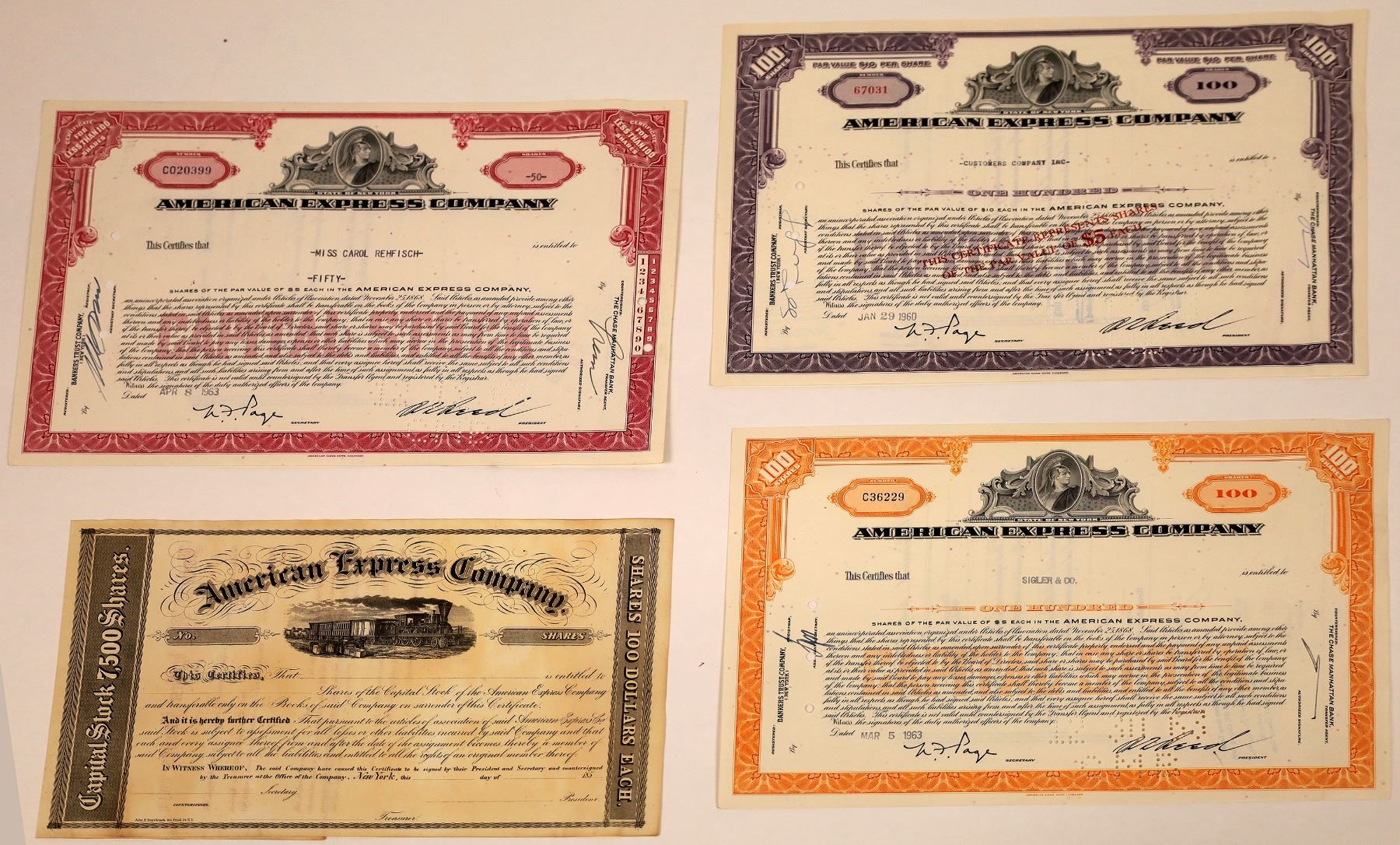 Lot of 4 different. Includes: unissued 1850s stock with locomotive vignette; and three different stocks issued in 1960 and 1963 (x2), all punch cancelled, ABN.