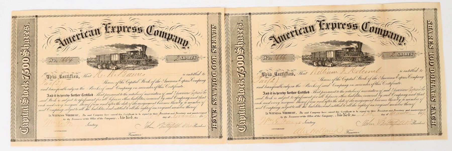 Lot of 2. These are early, and represent the period when Henry Wells had to step away and John Butterfield signed as vice president. Both issued in 1859, both signed by John Butterfield as vice president and William Fargo as secretary. One is also signed by Alex. Holland as treasurer. Folds, toning. Fargo would go on to create Wells, Fargo & Company. Butterfield was involved in railroad and stage companies. For the full story on this company and the different stocks they issued, please see Fred's essay on holabirdamericana.com.