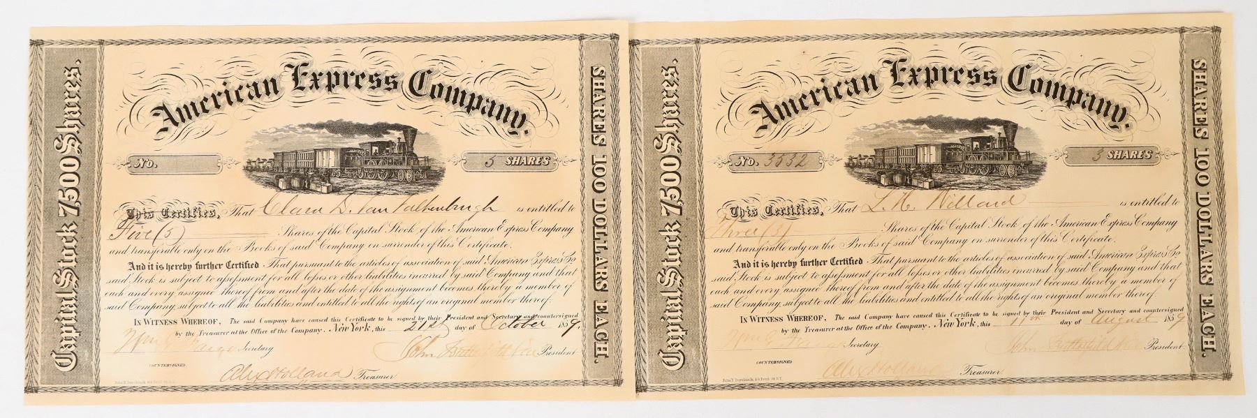 Lot of 2. These are early, and represent the period when Henry Wells had to step away and John Butterfield signed as vice president. Both issued in 1859, both signed by John Butterfield as vice president, William Fargo as secretary, and Alex. Holland as treasurer. Folds, toning. Fargo would go on to create Wells, Fargo & Company. Butterfield was involved in railroad and stage companies. For the full story on this company and the different stocks they issued, please see Fred's essay on holabirdamericana.com.
