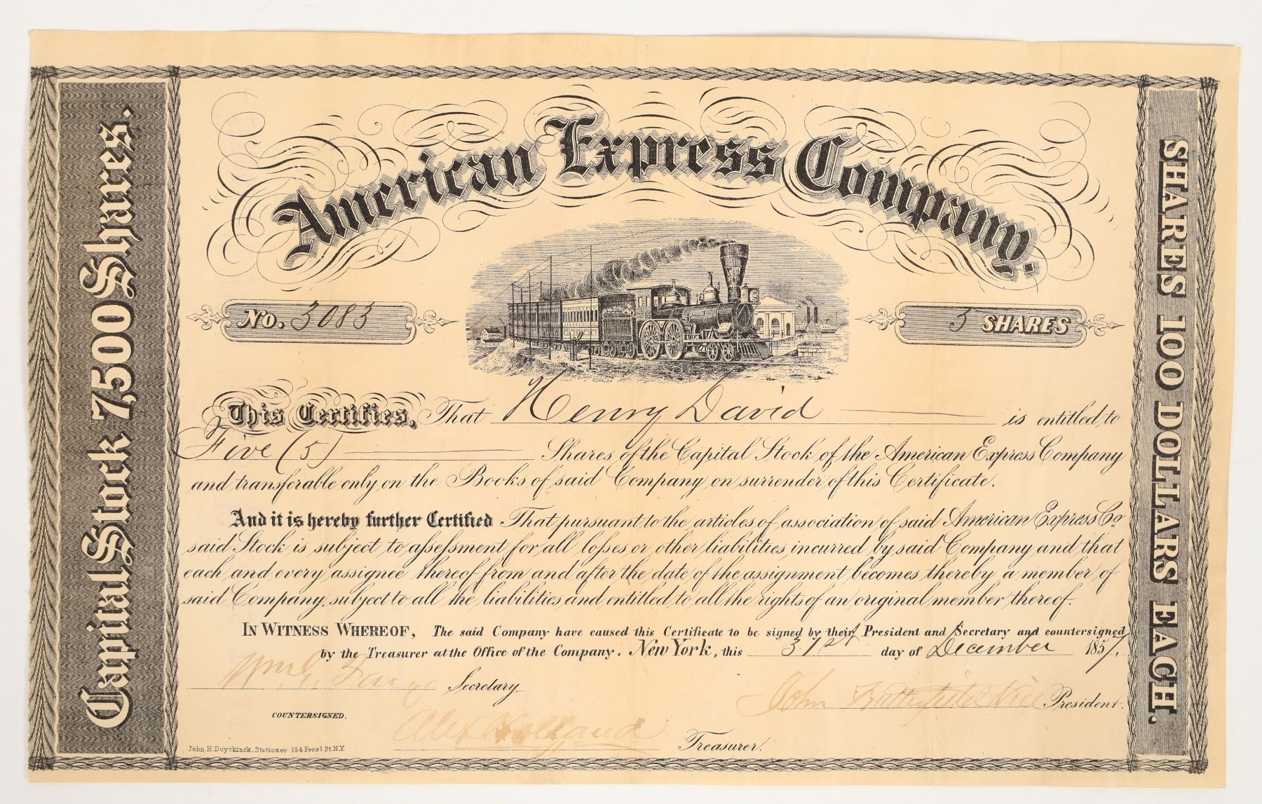 Very early! Signatures of three key players: Butterfield, Fargo, Holland. No. 3083, issued for 5 shares to Henry David in 1857. Signed by John Butterfield as vice president, William S. Fargo as secretary, and Alex Holland as treasurer. Not cancelled. Locomotive vignette. Folds, toning. This was during the period when Henry Wells had to step away from the company due to financial problems with his other investments (Livingston, Wells, & Co.), leading to the unusual autograph pair of Butterfield and Fargo on certificates from Oct. 1856-Nov. 1857. The company had also received a contract with the powerful New York Central Railroad. John Butterfield was a transportation pioneer in the mid-19th century in the American Northwest and Southwest. He founded many companies, including American Express which is still in operation today. The Butterfield Overland Mail Company was the longest stagecoach line in the world. William Fargo would go on to form Wells, Fargo & Company with Henry Wells. For more history on the company and the different stock types issued, please see Fred Holabird's essay at: https://www.holabirdamericana.com/s/American-Express-and-Wells-Fargo-ajhp.pdf.