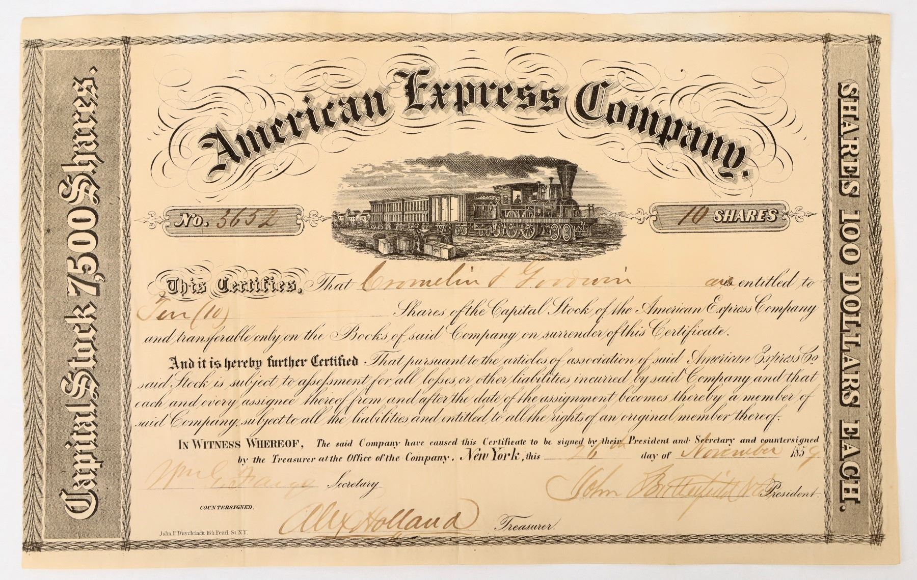 This is early, and represent the period when Henry Wells had to step away and John Butterfield signed as vice president. Issued in 1859, signed by John Butterfield as vice president, William Fargo as secretary, and Alex. Holland as treasurer. Folds, toning. Fargo would go on to create Wells, Fargo & Company. Butterfield was involved in railroad and stage companies. For the full story on this company and the different stocks they issued, please see Fred's essay on holabirdamericana.com.