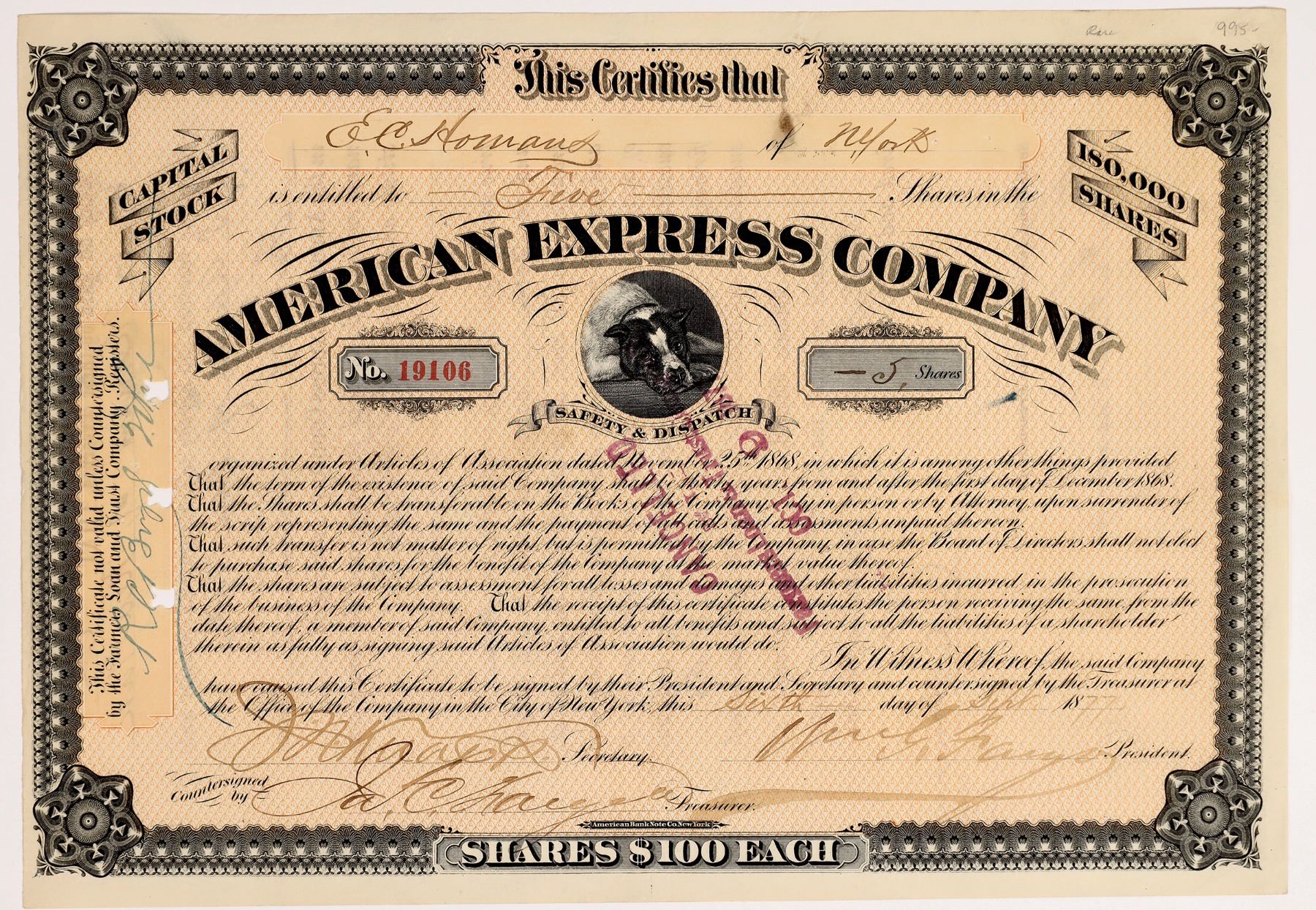 This is classified as a Type 8 certificate (see Holabird's essay on American Express stocks on holabirdamericana.com). It signifies the company's return to their original name from American Union Merchants Express. No. 19106, issued to E.C. Homans of New York in 1877. Signed by William Fargo as president, James C. Fargo as treasurer, and Knapp as secretary. Punch hole and stamp cancelled. Black border, tan underprint, and Safety & Dispatch dog vignette. ABN. 8 x 11.5" William Fargo was a key early founder of the company, and also founded Wells, Fargo & Co. with Henry Wells. James C. Fargo was his brother and was a president of the American Express Company for 30 years.