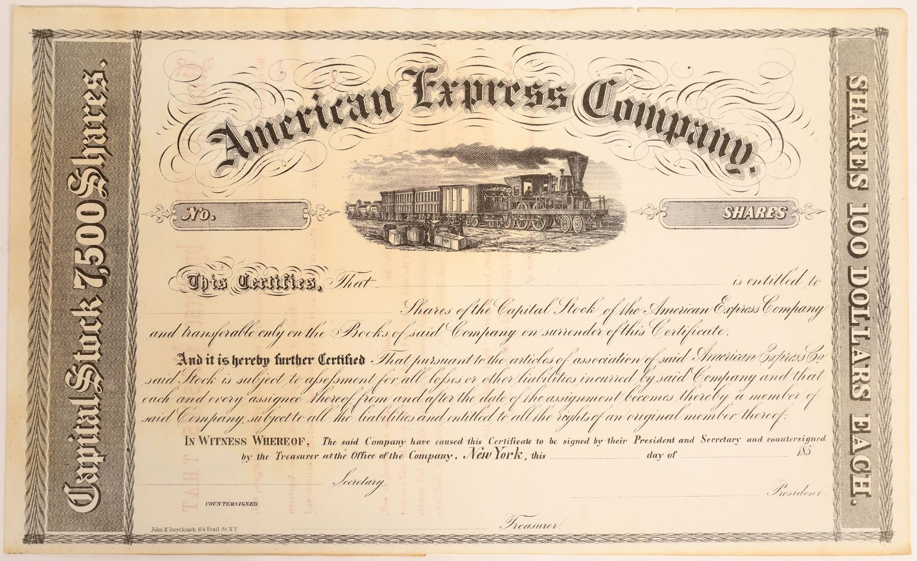 A single stock certificate unissued type 2g, the finest of the five unissued certificates in the Prag collection. Capital stock 7500 shares shares at $100 each from the back of the original American Express stock certificate book.