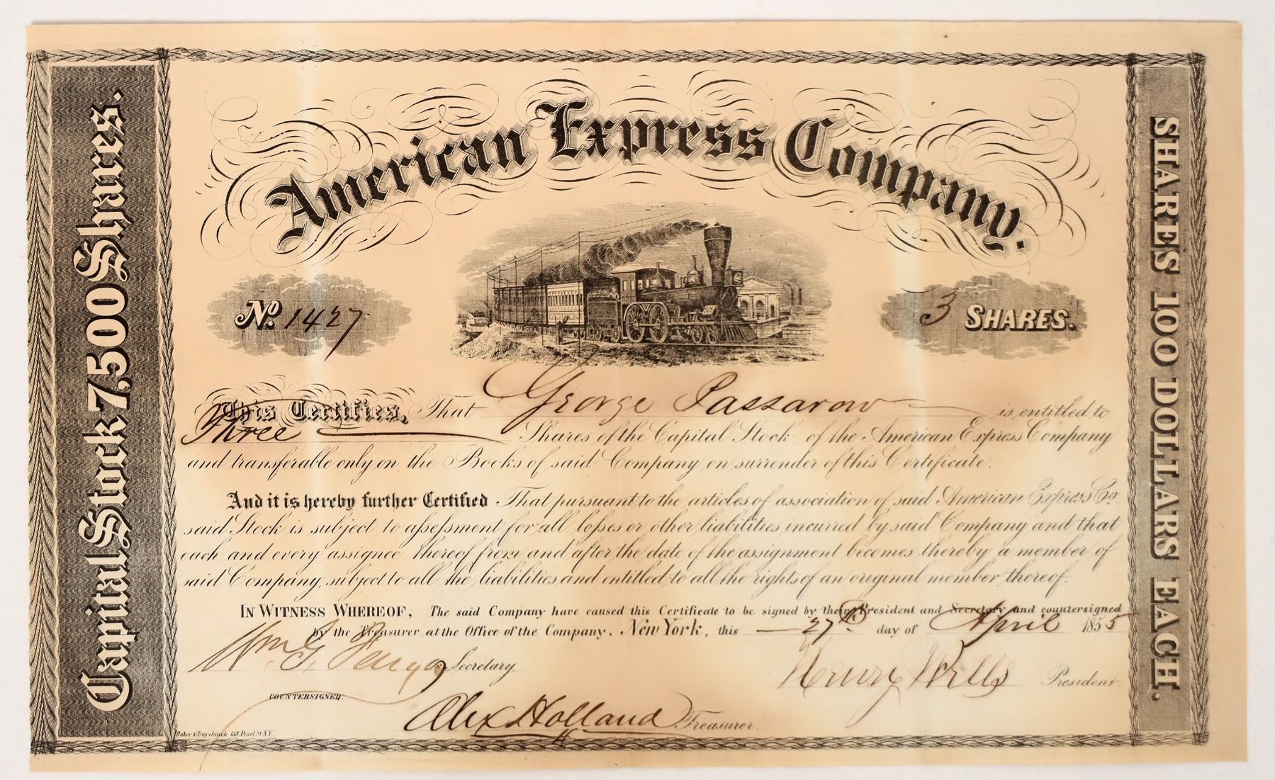 American Express Company stock certificate signed by Henry Wells and William Fargo and issued to George Tassarow (?). It is for three shares at $100 per and dated April 27, 1855. There's a steam locomotive vignette in the center. Certificate is in very nice condition. Please see photos for more details. For more history on the company and the different stock types issued, please see Fred Holabird's essay at: https://www.holabirdamericana.com/s/American-Express-and-Wells-Fargo-ajhp.pdf